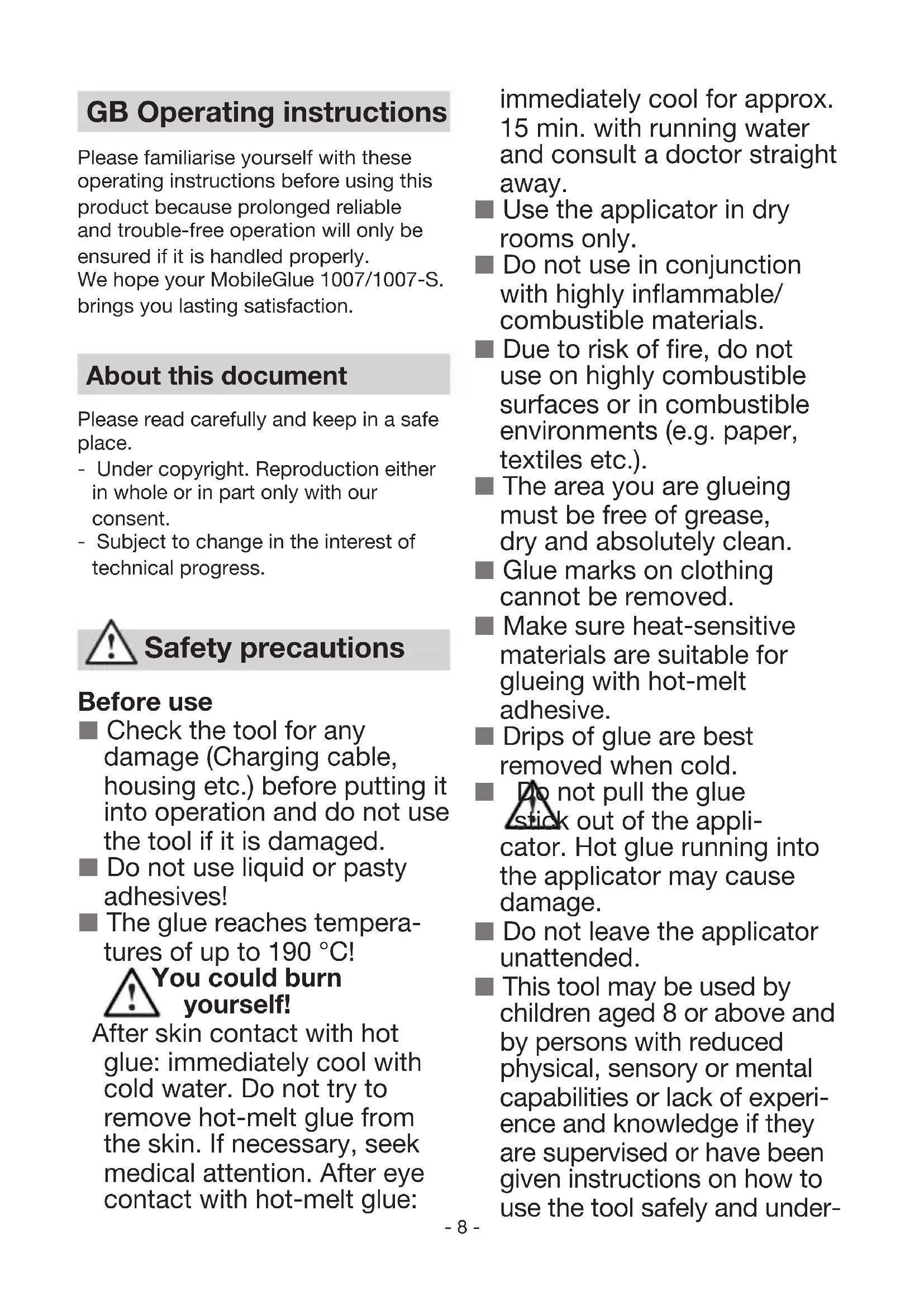 HERSTELLER GARANTIE HERSTELLER GARANTIE Werfen Sie Altgeräte, Akkus/Batterien nicht in den Hausmüll, ins Feuer oder ins Wasser. Akkus/Batterien sollen gesammelt, recycelt oder auf umweltfreundliche Weise entsorgt werden.Nur für EU-Länder: Gemäß der Richtlinie RL 2006/66/EG müssen defekte oder verbrauchte Akkus/Batterien recycelt werden. Nicht mehr gebrauchsfähige Akkus/Batterien können in der Verkaufsstelle oder eine Schadstoff-sammelstelle abgegeben werden. DE- 8 - GB Operating instructions Please familiarise yourself with these operating instructions before using this product because prolonged reliable and trouble-free operation will only be ensured if it is handled properly. We hope your MobileGlue 1007/1007-S. brings you lasting satisfaction. About this document Please read carefully and keep in a safe place. - Under copyright. Reproduction either in whole or in part only with our consent. - Subject to change in the interest of technical progress. Before use Check the tool for any damage (Charging cable, housing etc.) before putting it into operation and do not use the tool if it is damaged. Do not use liquid or pasty adhesives! The glue reaches tempera- tures of up to 190 °C! You could burn yourself! After skin contact with hot glue: immediately cool with cold water. Do not try to remove hot-melt glue from the skin. If necessary, seek medical attention. After eye contact with hot-melt glue: Safety precautions immediately cool for approx. 15 min. with running water and consult a doctor straight away. Use the applicator in dry rooms only. Do not use in conjunction with highly inflammable/ combustible materials. Due to risk of fire, do not use on highly combustible surfaces or in combustible environments (e.g. paper, textiles etc.). The area you are glueing must be free of grease, dry and absolutely clean. Glue marks on clothing cannot be removed. Make sure heat-sensitive materials are suitable for glueing with hot-melt adhesive. Drips of glue are best removed when cold. Do not pull the glue stick out of the appli- cator. Hot glue running into the applicator may cause damage. Do not leave the applicator unattended. This tool may be used by children aged 8 or above and by persons with reduced physical, sensory or mental capabilities or lack of experi- ence and knowledge if they are supervised or have been given instructions on how to use the tool safely and under-- 9 - stand the hazards involved. Do not allow children to play with the tool. Children are not allowed to clean or carry out maintenance work on the applicator without supervi- sion. Proper operation is only guaranteed by using genuine STEINEL sticks. USB charging cable Keep the charging cable clean. Soiling may present the risk of an electric shock. Charge the applicator at a temperature ranging from 0 °C to 35 °C. Only charge the unit with the USB charging cable supplied with it (type 15.3841). Do not charge rechargeable bat- teries of other brands. They could catch fire or explode. Rechargeable battery Do not open the applicator or the rechargeable battery. This could cause a short circuit. The rechargeable battery must not be removed. In the event of problems, contact the retailer you purchased the applicator from. The lithium-ion rechargeable battery can be recharged at any time without shortening its lifespan. Interrupting the charge cycle will not damage the rechargeable battery. Proper use This electric tool is only intended for solvent-free glueing of handicraft mater- ials and model components at home. When taking out of use for a long time, put the applicator away with battery charged. This will prolong the life of the lithium-ion rechargeable battery. Vapours may escape if the rechargeable battery is used improperly or damaged. Seek medical attention if you feel unwell and provide fresh air. The vapours may cause respiratory irritation. Application Cordless hot-melt glue pen with rechargeable lithium-ion battery. The ideal all-purpose glue applicator for craft, decorating and making repairs. Suitable for: paper, card, cork, wood, leather, textiles, plastic, ceramics, foam, tiles etc. System components USB charging cable LED display Socket for charging cable ON/OFF button Feed trigger Glue stick GB- 10 - Operating principle and handling ■ Before using for the first time, fully charge the battery (2-3 hours) so as to prolong its life. (see Charging/ Operation) ■ Insert glue stick into rear heating duct. ■ When using the tool for the first time, press the trigger several times to fill the heating chamber with adhesive. It may also be necessary to give the glue stick a short push to help it move in. ■ To prevent the applicator from being switched ON unintentionally, you must press the button for approx. 2 sec. Green LED flashes for 15 sec. ■ Press trigger and apply glue to one side. ■ Firmly press together the materials being glued, correcting alignment if necessary. ■ Final bonding strength is reached after a very short time (approx. 2 minutes)! ■ Spot glueing is recommended on long items with large surfaces. ■ Rigid foam (e.g. polystyrene) can also be glued without a problem. Merely remember to apply the hot glue on the base surface and not on the polystyrene. ■ When glueing textiles or similar materials, it is recommended to apply the hot glue in "wavy" lines. ■ Let the applicator cool down after use. Charging / Operation The rechargeable battery in the Mo- bileGlue 1007/1007-S comes partially charged. Before using the applicator for the first time, fully charge the bat- tery (approx. 2-3 hours) to ensure full capacity. The MobileGlue 1007/1007-S cannot be used while it is charging. Interrupting the charge cycle will not damage the rechargeable battery. The battery can be recharged at any time without shortening its lifespan. "Electronic Cell Protection (ECP)" protects the battery from exhaustive discharge. If the battery runs flat, pro- tective circuitry switches the MobileGlue 100