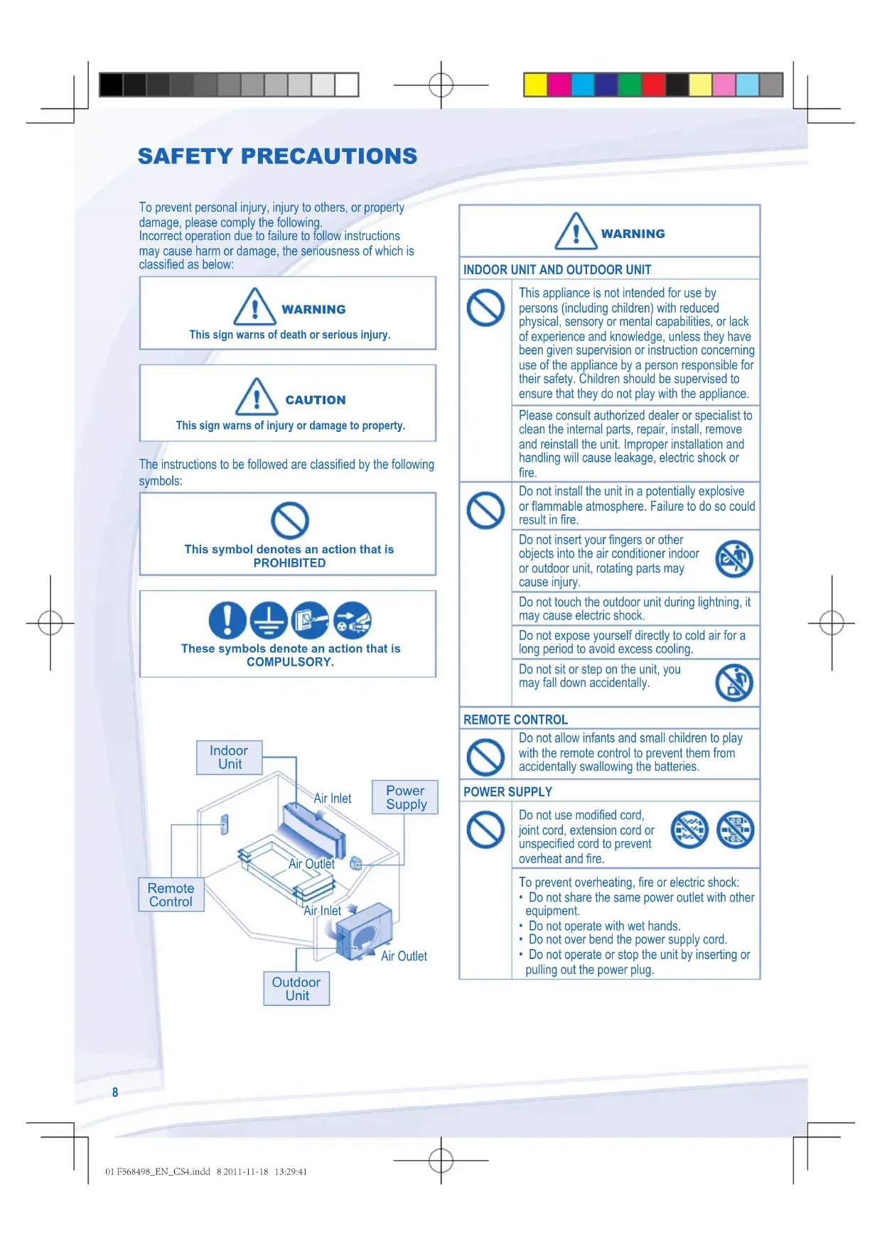 - Do not operate or stop the unit by inserting or pulling out the power plug. Air Inlet Air Outlet Air Outlet Air Inlet Remote Control Power Supply Indoor Unit Outdoor Unit 01 F568498_EN_CS4.indd 8 2011-11-18 13:29:41ENGLISH