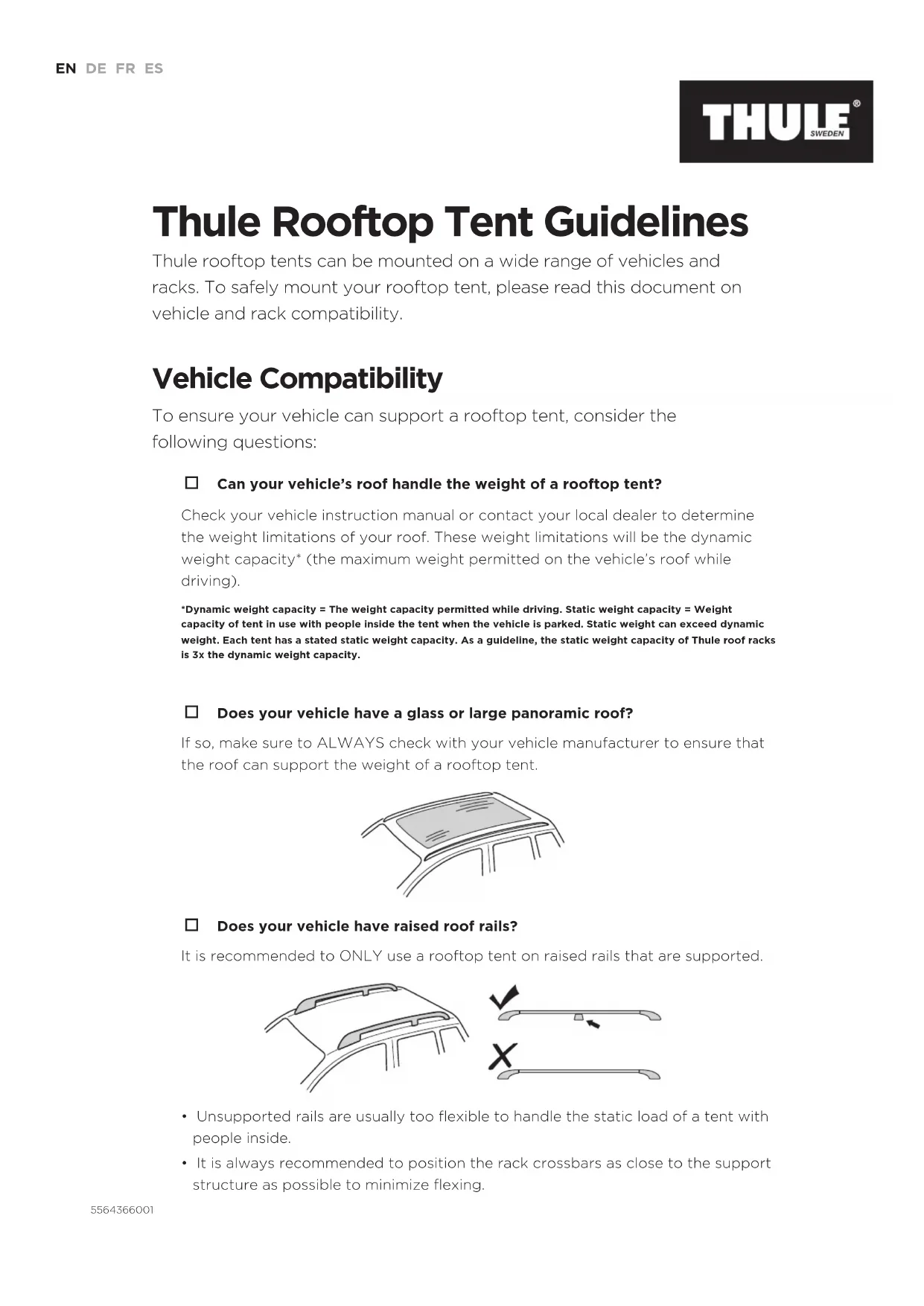Vehicle Compatibility To ensure your vehicle can support a rooftop tent, consider the following questions: Can your vehicle’s roof handle the weight of a rooftop tent? Check your vehicle instruction manual or contact your local dealer to determine the weight limitations of your roof. These weight limitations will be the dynamic weight capacity* (the maximum weight permitted on the vehicle’s roof while driving). *Dynamic weight capacity = The weight capacity permitted while driving. Static weight capacity = Weight capacity of tent in use with people inside the tent when the vehicle is parked. Static weight can exceed dynamic weight. Each tent has a stated static weight capacity. As a guideline, the static weight capacity of Thule roof racks is 3x the dynamic weight capacity. Does your vehicle have a glass or large panoramic roof? If so, make sure to ALWAYS check with your vehicle manufacturer to ensure that the roof can support the weight of a rooftop tent. Does your vehicle have raised roof rails? It is recommended to ONLY use a rooftop tent on raised rails that are supported.