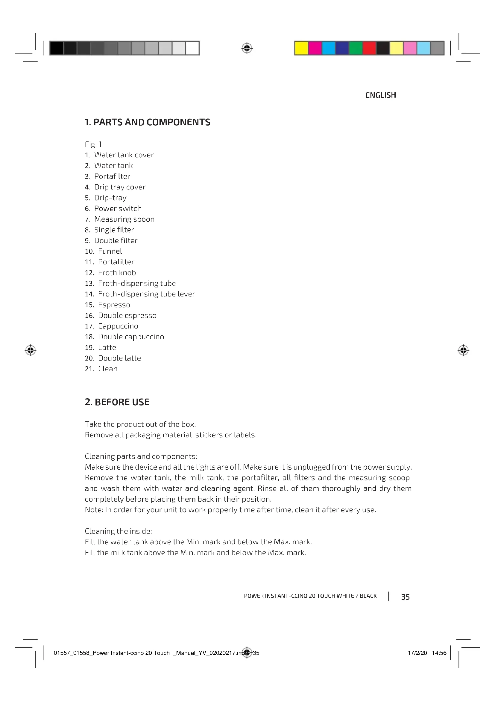 Take the product out of the box. Remove all packaging material, stickers or labels. Cleaning parts and components: Make sure the device and all the lights are off. Make sure it is unplugged from the power supply. Remove the water tank, the milk tank, the portafilter, all filters and the measuring scoop and wash them with water and cleaning agent. Rinse all of them thoroughly and dry them completely before placing them back in their position. Note: In order for your unit to work properly time after time, clean it after every use. Cleaning the inside: Fill the water tank above the Min. mark and below the Max. mark. Fill the milk tank above the Min. mark and below the Max. mark. 01557_01558_Power Instant-ccino 20 Touch _Manual_YV_02020217.indd 3501557_01558_Power Instant-ccino 20 Touch _Manual_YV_02020217.indd 35 17/2/20 14:5617/2/20 14:5636 ENGLISH Select one of the filters and place it inside the portafilter. Place the portafilter in the unit ensuring it is properly locked and place a cup under it. Make sure the dispensing tube is inside the cup. Plug the appliance to a power supply. Turn the power switch on. The buttons on the device will blink 3 times and the device will beep. Once the buttons’ lights turn steady, press the “Double Cappuccino” button. The process will be over once all the lights are steady.