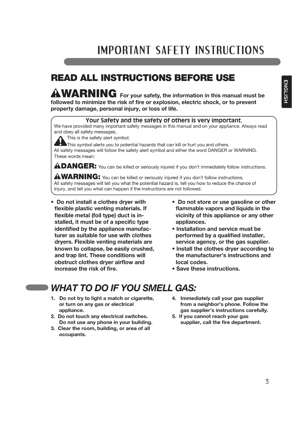 - Savetheseinstructions. wWARNING For your safety, the information in this manual must be followed to minimize the risk of fire or explosion, electric shock, or to prevent property damage, personal injury, or loss of life.READ ALL INSTRUCTIONS BEFORE USE wWARNING For your safety, the information in this manual must be followed to minimize the risk of fire or explosion, electric shock, or to prevent property damage, personal injury, or loss of life. CALIFORNIA SAFE DRINkING WATER AND TOxIC ENFORCEMENT ACT This act requires the governor of California to publish a list of substances known to the state to cause cancer, birth defects, or other reproductive harm and requires businesses to warn customers of potential exposure to such substances. Gas appliances can cause minor exposure to four of these substances, namely benzene, carbon monoxide, formaldehyde, and soot, caused primarily by the incomplete combustion of natural gas or LP fuels. Properly adjusted dryers will minimize incomplete combustion. Exposure to these substances can be minimized further by properly venting the dryer to the outdoors.
