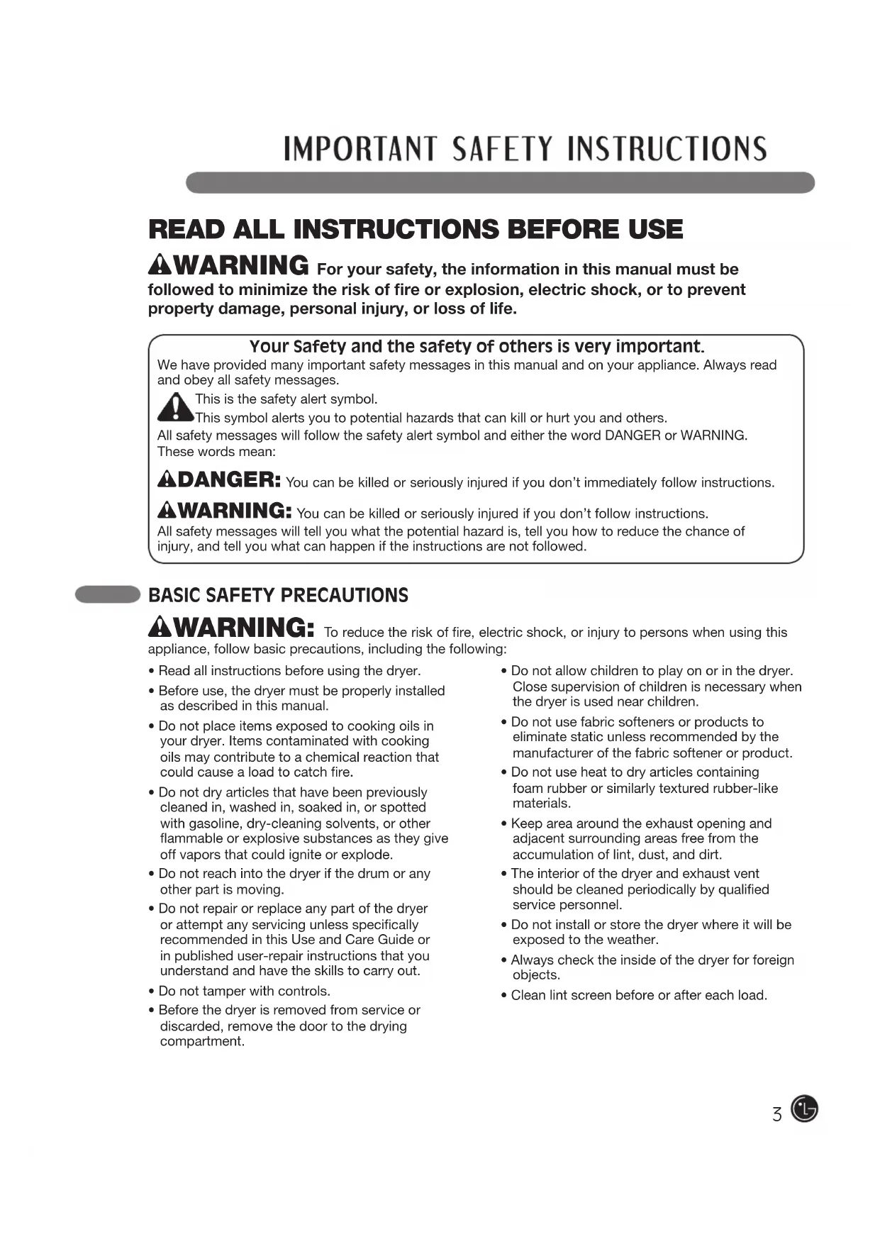 wWARNING: To reduce the risk of fire, electric shock, or injury to persons when using this appliance, follow basic precautions, including the following:•Readallinstructionsbeforeusingthedryer.•Beforeuse,thedryermustbeproperlyinstalledas described in this manual.•Donotplaceitemsexposedtocookingoilsinyour dryer. Items contaminated with cooking oils may contribute to a chemical reaction that could cause a load to catch fire. •Donotdryarticlesthathavebeenpreviouslycleaned in, washed in, soaked in, or spotted with gasoline, dry-cleaning solvents, or other flammable or explosive substances as they give off vapors that could ignite or explode.•Donotreachintothedryerifthedrumoranyother part is moving.•Donotrepairorreplaceanypartofthedryeror attempt any servicing unless specifically recommended in this Use and Care Guide or in published user-repair instructions that you understand and have the skills to carry out.•Donottamperwithcontrols.•Beforethedryerisremovedfromserviceordiscarded, remove the door to the drying compartment.•Donotallowchildrentoplayonorinthedryer.Close supervision of children is necessary when the dryer is used near children.•Donotusefabricsoftenersorproductstoeliminate static unless recommended by the manufacturer of the fabric softener or product.•Donotuseheattodryarticlescontainingfoam rubber or similarly textured rubber-like materials.•Keepareaaroundtheexhaustopeningandadjacent surrounding areas free from the accumulation of lint, dust, and dirt.•Theinteriorofthedryerandexhaustventshould be cleaned periodically by qualified service personnel.•Donotinstallorstorethedryerwhereitwillbeexposed to the weather.•Alwayschecktheinsideofthedryerforforeignobjects.•Cleanlintscreenbeforeoraftereachload.