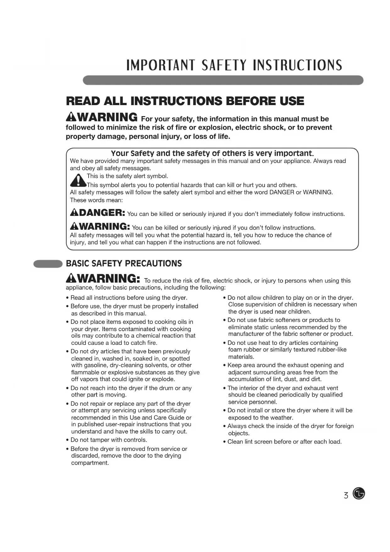 wWARNING: To reduce the risk of fire, electric shock, or injury to persons when using this appliance, follow basic precautions, including the following:•Readallinstructionsbeforeusingthedryer.•Beforeuse,thedryermustbeproperlyinstalledas described in this manual.•Donotplaceitemsexposedtocookingoilsinyour dryer. Items contaminated with cooking oils may contribute to a chemical reaction that could cause a load to catch fire. •Donotdryarticlesthathavebeenpreviouslycleaned in, washed in, soaked in, or spotted with gasoline, dry-cleaning solvents, or other flammable or explosive substances as they give off vapors that could ignite or explode.•Donotreachintothedryerifthedrumoranyother part is moving.•Donotrepairorreplaceanypartofthedryeror attempt any servicing unless specifically recommended in this Use and Care Guide or in published user-repair instructions that you understand and have the skills to carry out.•Donottamperwithcontrols.•Beforethedryerisremovedfromserviceordiscarded, remove the door to the drying compartment.•Donotallowchildrentoplayonorinthedryer.Close supervision of children is necessary when the dryer is used near children.•Donotusefabricsoftenersorproductstoeliminate static unless recommended by the manufacturer of the fabric softener or product.•Donotuseheattodryarticlescontainingfoam rubber or similarly textured rubber-like materials.•Keepareaaroundtheexhaustopeningandadjacent surrounding areas free from the accumulation of lint, dust, and dirt.•Theinteriorofthedryerandexhaustventshould be cleaned periodically by qualified service personnel.•Donotinstallorstorethedryerwhereitwillbeexposed to the weather.•Alwayschecktheinsideofthedryerforforeignobjects.•Cleanlintscreenbeforeoraftereachload.