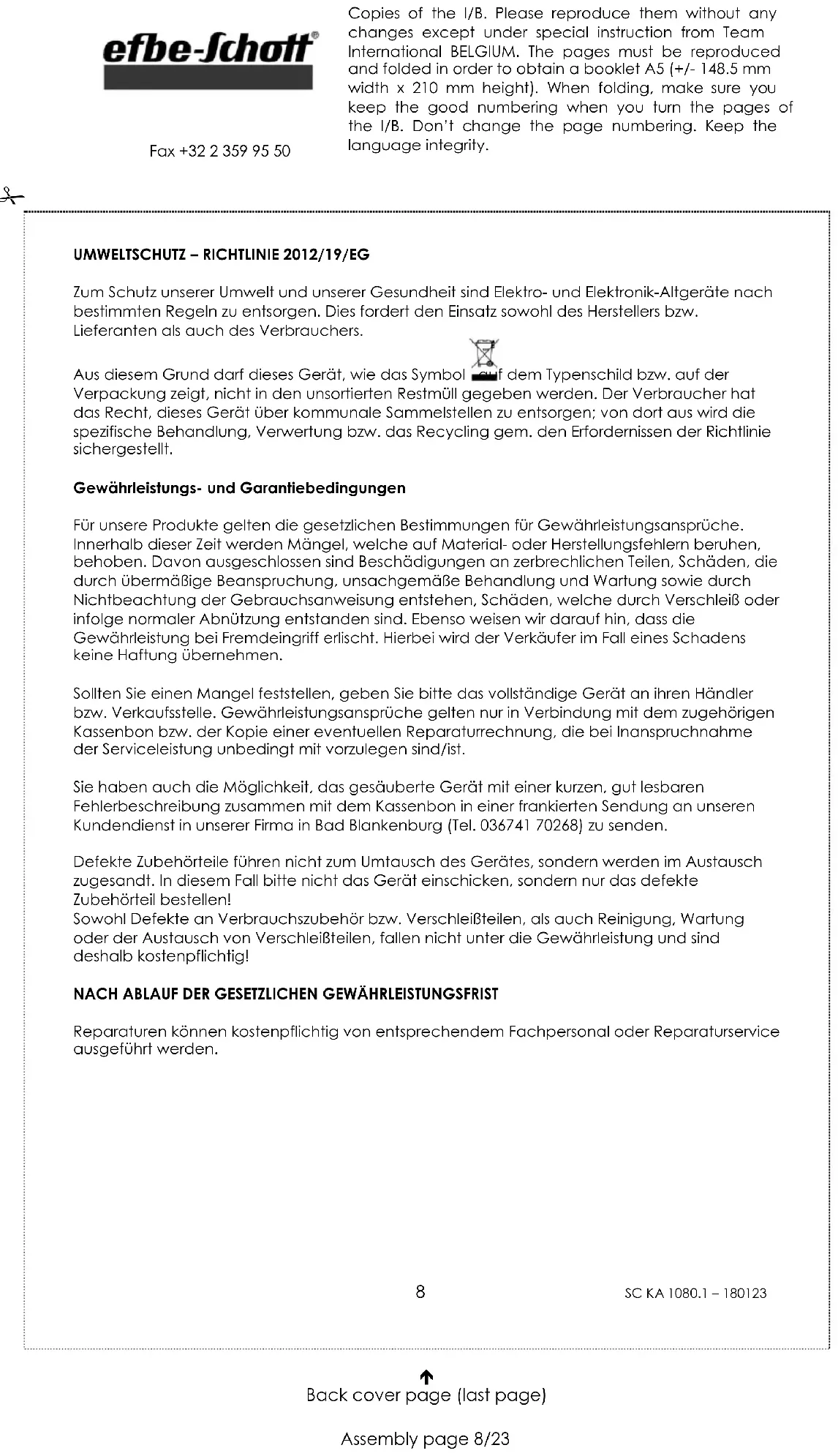 Copies of the I/B. Please reproduce them without any changes except under special instruction from Team International BELGIUM. The pages must be reproduced and folded in order to obtain a booklet A5 (+/- 148.5 mm width x 210 mm height). When folding, make sure you keep the good numbering when you turn the pages of the I/B. Don’t change the page numbering. Keep the language integrity. Front cover page (first page) Assembly page 1/23
