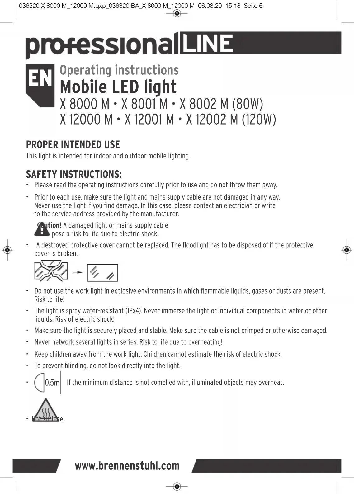 Operating instructions Mobile LED light X 8000 M • X 8001 M • X 8002 M (80W) X 12000 M • X 12001 M • X 12002 M (120W) www.brennenstuhl.com6 036320 X 8000 M_12000 M.qxp_036320 BA_X 8000 M_12000 M 06.08.20 15:18 Seite 6TECHNICAL SPECIFICATIONS OPERATION Setting up and turning on the light Place the light on a dry, flat surface. Only use the light with the bracket extended. The adjustable bracket can be adjusted to several levels and can be used to set the light at different tilt angles. Tripod mounting material A set of screws is included for mounting the spotlight on firing chair stands. 1x M6x45 screw + 1x washer, 2x M6x60 screws, 2x washers and 2x nuts. Mounting the light on a tripod The light can be mounted on a suitable tripod using the holes on bracket (mounting material not included!). Make sure the tripod is sufficiently stable and the light is securely mounted. Switching and Dimming the light Switch on the spotlight with the switch on the back. The light intensity can be adjusted in steps and continuously: Steps dimming: by pressing the switch twice, 100 and 50% light can be adjusted. Stepless dimming: press the switch permanently – the light intensity is slowly reduced. Proceed in the same way to increase the intensity again. If the switch is left in any of its “on” positions for longer than 3 seconds, then pressing it once again will always turn it off.