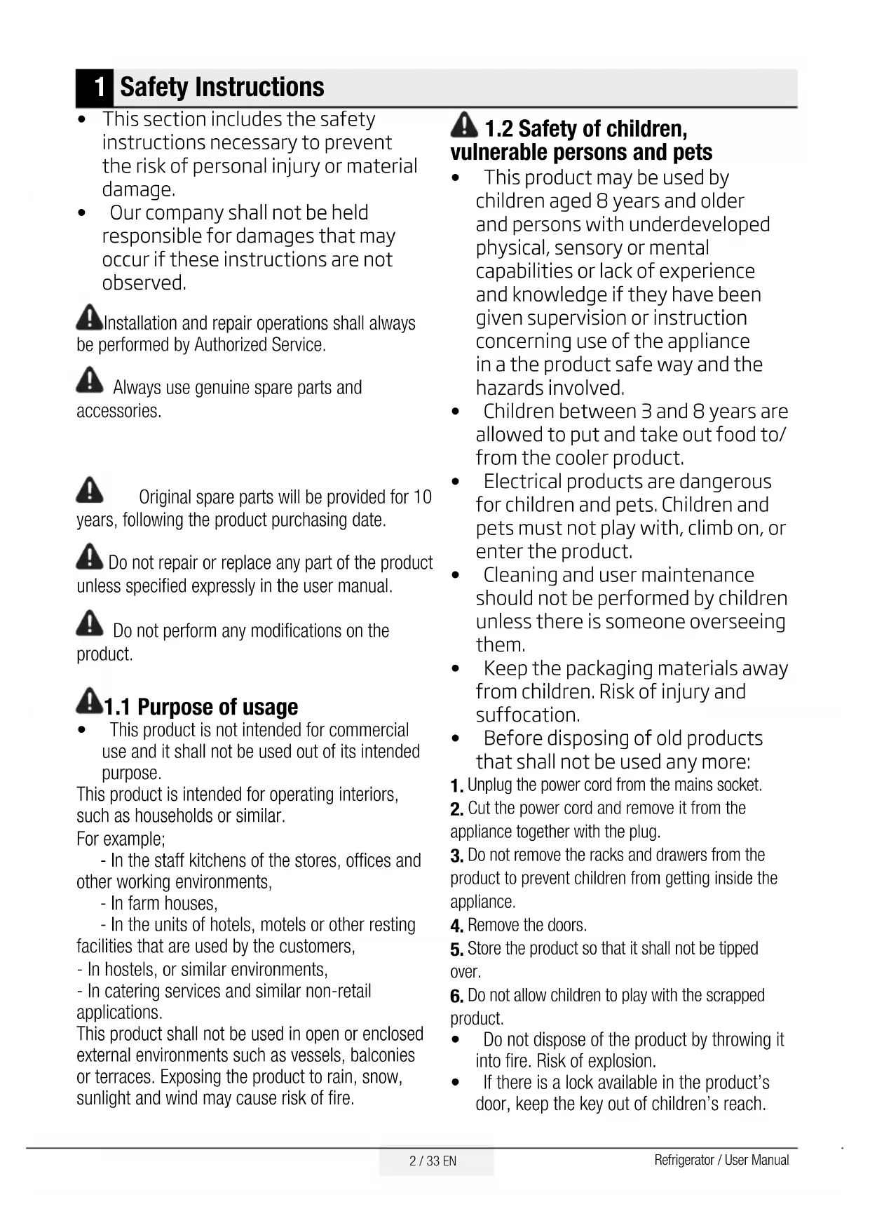 Do not allow children to play with the scrapped product. t Do not dispose of the product by throwing it into fire. Risk of explosion. t If there is a lock available in the product’s door, keep the key out of children’s reach. 1 Safety Instructions t This section includes the safety instructions necessary to prevent the risk of personal injury or material damage. t Our company shall not be held responsible for damages that may occur if these instructions are not observed. Installation and repair operations shall always be performed by Authorized Service. Always use genuine spare parts and accessories. Original spare parts will be provided for 10 years, following the product purchasing date. Do not repair or replace any part of the product unless specified expressly in the user manual. Do not perform any modifications on the product.