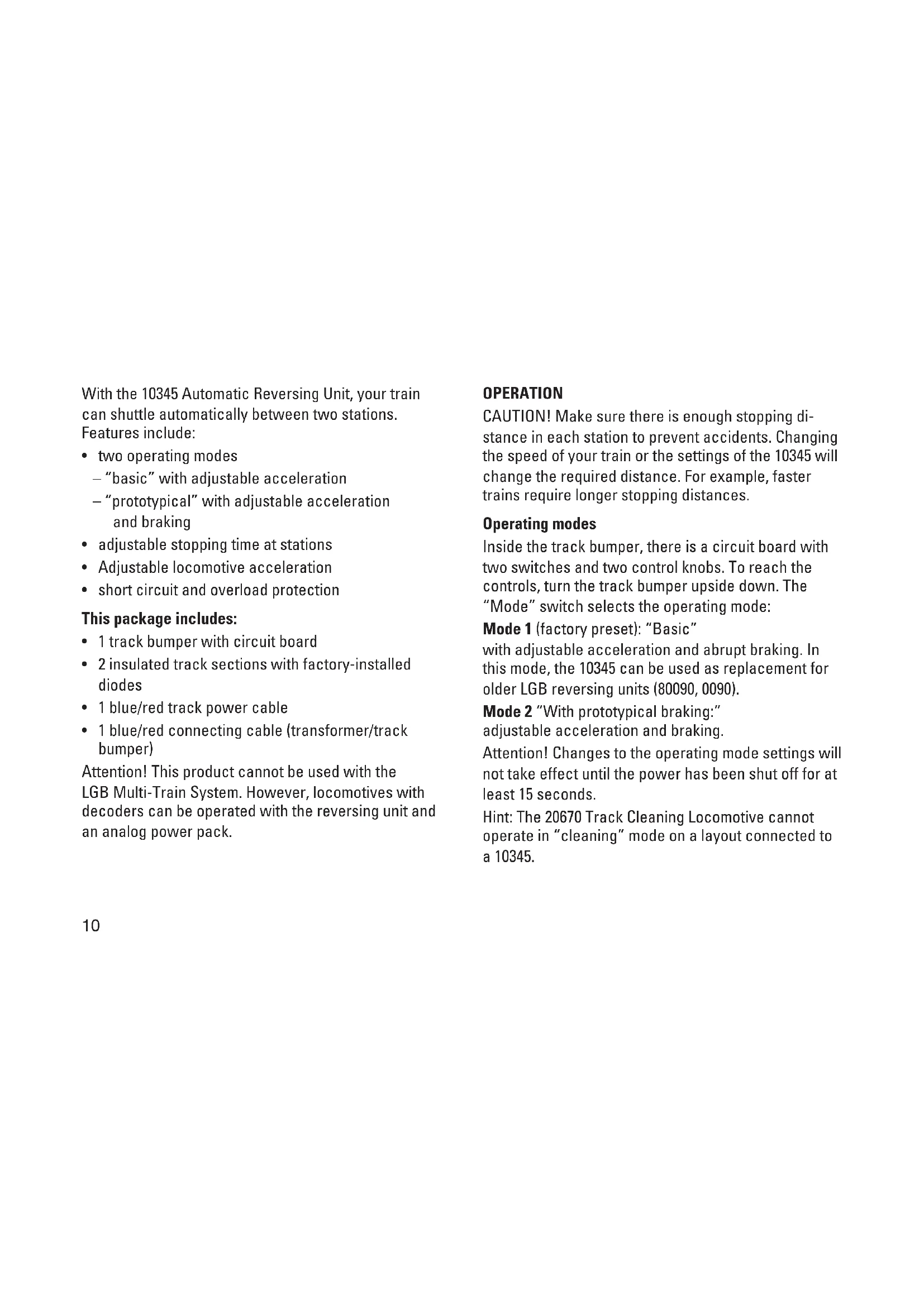 - 1 blue/red connecting cable (transformer/track bumper) Attention! This product cannot be used with the LGB Multi-Train System. However, locomotives with decoders can be operated with the reversing unit and an analog power pack. OPERATION CAUTION! Make sure there is enough stopping di- stance in each station to prevent accidents. Changing the speed of your train or the settings of the 10345 will change the required distance. For example, faster trains require longer stopping distances. Operating modes Inside the track bumper, there is a circuit board with two switches and two control knobs. To reach the controls, turn the track bumper upside down. The “Mode” switch selects the operating mode: Mode 1 (factory preset): “Basic” with adjustable acceleration and abrupt braking. In this mode, the 10345 can be used as replacement for older LGB reversing units (80090, 0090). Mode 2 “With prototypical braking:” adjustable acceleration and braking. Attention! Changes to the operating mode settings will not take effect until the power has been shut off for at least 15 seconds. Hint: The 20670 Track Cleaning Locomotive cannot operate in “cleaning” mode on a layout connected to a 10345.11 MODE 1 (“BASIC”) Preparation