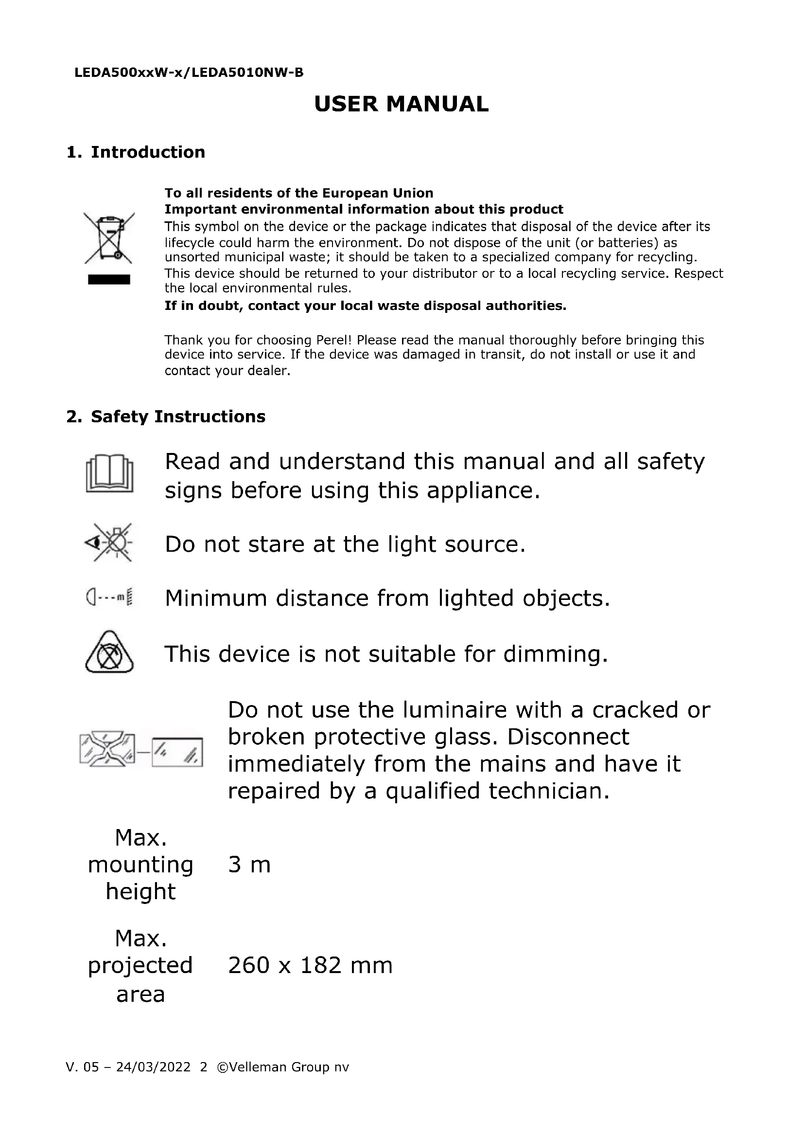 The copyright to this manual is owned by Velleman Group nv. All worldwide rights reserved. No part of this manual may be copied, reproduced, translated or reduced to any electronic medium or otherwise without the prior written consent of the copyright holder.LEDA500xxW-x/LEDA5010NW-B