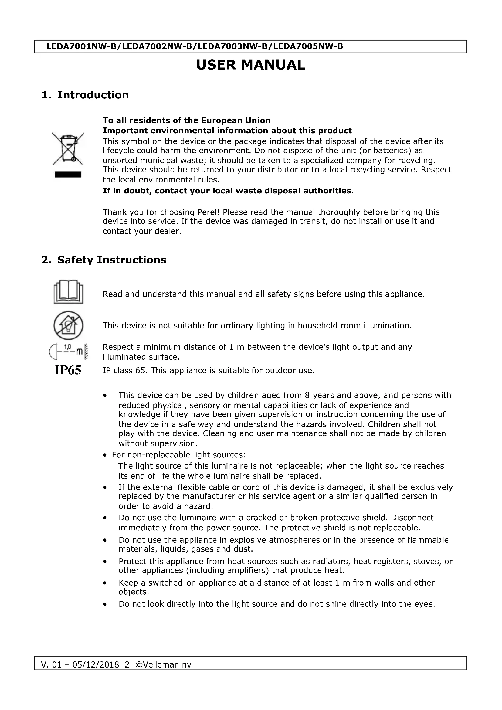 The copyright to this manual is owned by Velleman nv. All worldwide rights reserved. No part of this manual may be copied, reproduced, translated or reduced to any electronic medium or otherwise without the prior written consent of the copyright holder.LEDA7001NW-B/LEDA7002NW-B/LEDA7003NW-B/LEDA7005NW-B