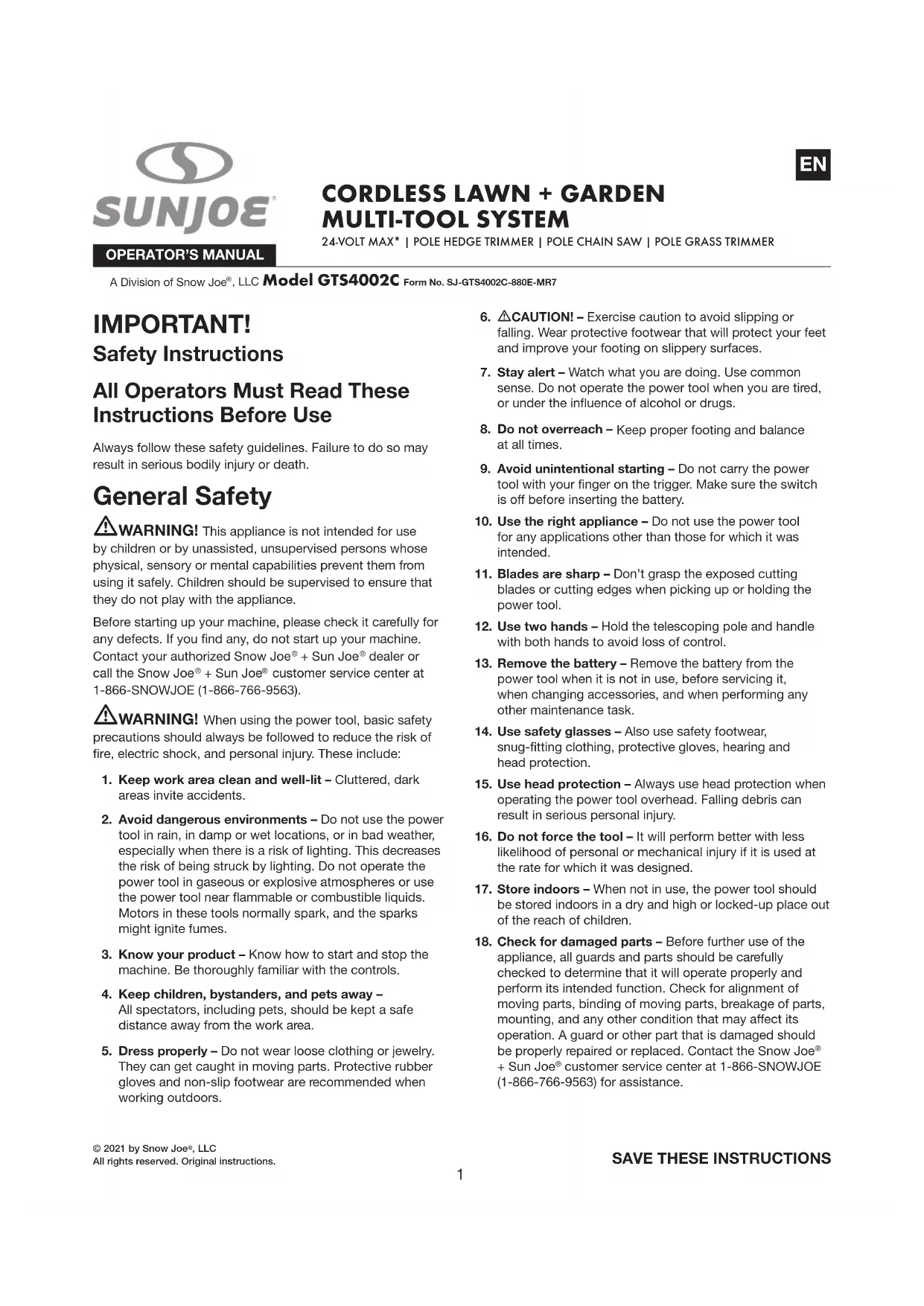 GTS4002C cordless lawn + garden multi-tool system, please visit sunjoe.com or contact the Snow Joe