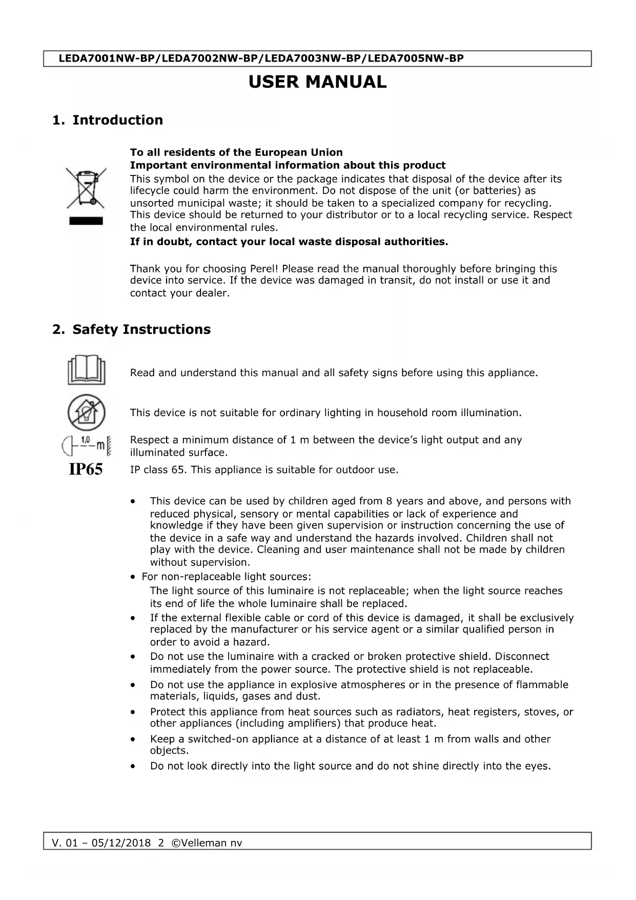 The copyright to this manual is owned by Velleman nv. All worldwide rights reserved. No part of this manual may be copied, reproduced, translated or reduced to any electronic medium or otherwise without the prior written consent of the copyright holder.LEDA7001NW-BP/LEDA7002NW-BP/LEDA7003NW-BP/LEDA7005NW-BP
