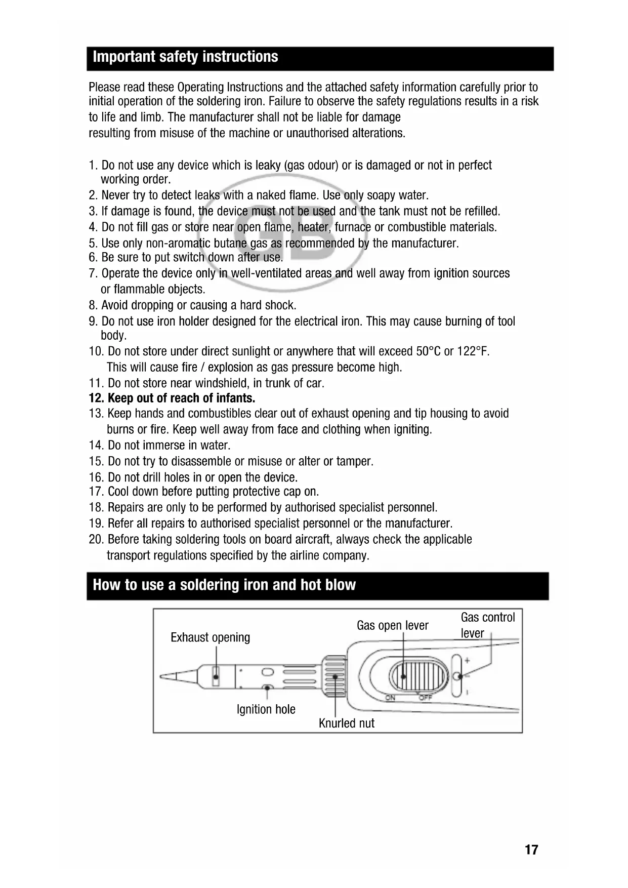 transport regulations specified by the airline company. Important safety instructions How to use a soldering iron and hot blow Exhaust opening Ignition hole Knurled nut Gas control lever Gas open lever WP 60K_9x15:Pyropen jr.qxd 06.12.12 16:04 Seite 1618 Ignition Instructions