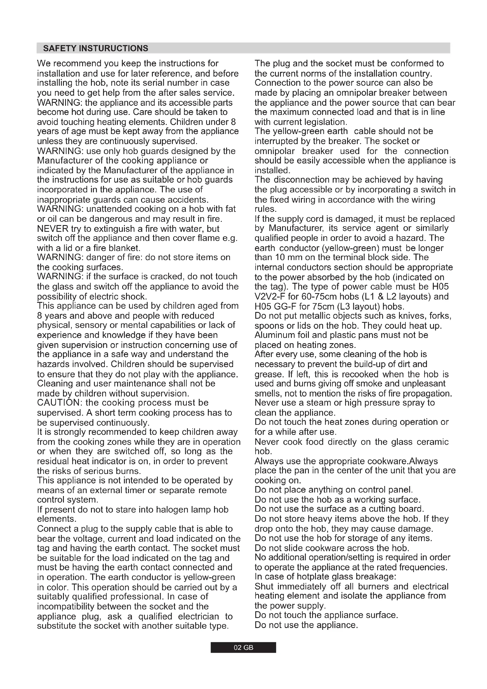 1402 GB SAFETY INSTURUCTIONS We recommend you keep the instructions for installation and use for later reference, and before installing the hob, note its serial number in case you need to get help from the after sales service.
