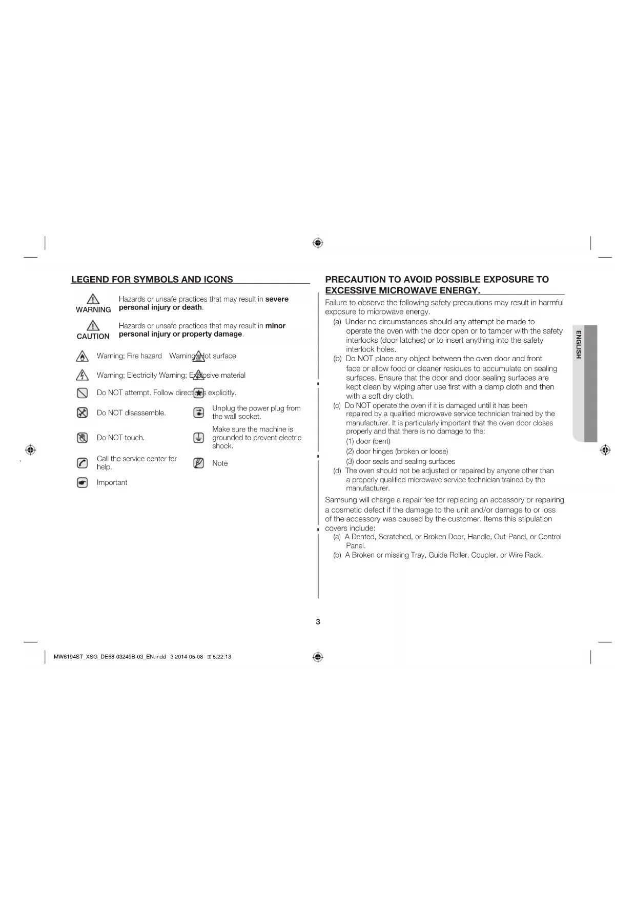 WARNING Hazards or unsafe practices that may result in severe personal injury or death. CAUTION Hazards or unsafe practices that may result in minor personal injury or property damage. Warning;Firehazard Warning; Hot surface Warning; Electricity Warning; Explosive material Do NOT attempt. Followdirectionsexplicitly. Do NOT disassemble. Unplug the power plug from the wall socket. Do NOT touch. Make sure the machine is grounded to prevent electric shock. Call the service center for help. Note Important MW6194ST_XSG_DE68-03249B-03_EN.indd 2 2014-05-08 5:22:112