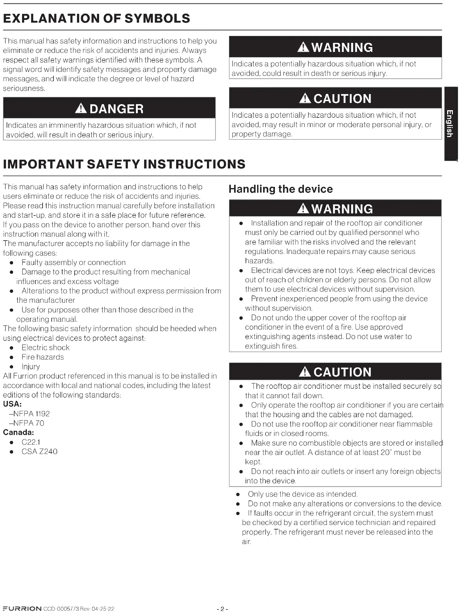 This manual has safety information and instructions to help users eliminate or reduce the risk of accidents and injuries. Please read this instruction manual carefully before installation and start-up, and store it in a safe place for future reference. If you pass on the device to another person, hand over this instruction manual along with it. The manufacturer accepts no liability for damage in the following cases: ● Faulty assembly or connection ● Damage to the product resulting from mechanical influences and excess voltage ● Alterations to the product without express permission from the manufacturer ● Use for purposes other than those described in the operating manual. The following basic safety information should be heeded when using electrical devices to protect against: ● Electric shock ● Fire hazards ● Injury All Furrion product referenced in this manual is to be installed in accordance with local and national codes, including the latest editions of the following standards: USA: – NFPA 1192 – NFPA 70 Canada: ● C22.1 ● CSA Z240 Handling the device WARNING ● Installation and repair of the rooftop air conditioner must only be carried out by qualified personnel who are familiar with the risks involved and the relevant regulations. Inadequate repairs may cause serious hazards. ● Electrical devices are not toys. Keep electrical devices out of reach of children or elderly persons. Do not allow them to use electrical devices without supervision. ● Prevent inexperienced people from using the device without supervision. ● Do not undo the upper cover of the rooftop air conditioner in the event of a fire. Use approved extinguishing agents instead. Do not use water to extinguish fires. CAUTION ● The rooftop air conditioner must be installed securely so that it cannot fall down. ● Only operate the rooftop air conditioner if you are certain that the housing and the cables are not damaged. ● Do not use the rooftop air conditioner near flammable fluids or in closed rooms. ● Make sure no combustible objects are stored or installed near the air outlet. A distance of at least 20” must be kept. ● Do not reach into air outlets or insert any foreign objects into the device. ● Only use the device as intended. ● Do not make any alterations or conversions to the device. ● If faults occur in the refrigerant circuit, the system must be checked by a certified service technician and repaired properly. The refrigerant must never be released into the air.English CCD-0005773 Rev: 04-25-22 - 3 - Handling Electrical Cables WARNING The electrical power supply must only be connected by a qualified electrician. CAUTION ● Refer to NEC (National Electric Code) for proper sizing of wire gauge (awg) based on cable length and overcurrent protection rating that is suppling power to the air conditioner. ● See rooftop unit nameplate for proper overcurrent protection sizing. ● Attach and lay the cables so that they cannot be tripped over or damaged. ● Only a qualified electrician should connect the rooftop air conditioner to electrical power. ● Do not lay loose or bent cables next to electrically conductive materials. ● Do not pull on the cables. ● Use cable ducts to lay cables through walls with sharp edges. ● Refer to rooftop unit nameplate and NEC for proper power supply rating. BEFORE INSTALLING Read this installation manual completely before installing the rooftop air conditioner. The following tips and instructions must be observed while installing the rooftop air conditioner. What’s in the Box Open and remove the components from carton. Make sure you have all the following items included in the packaging, if any item is missing, contact your dealer. Rooftop Unit (sold separately): Rooftop Unit Mounting Frame Filter ADB Shroud Control Box Bolt Control Knob Lower Duct Divider with Plastic Screws Upper Duct Divider PE Foam Screw Cap ● Rooftop Unit x 1 ● Warranty Manual x 1 Air Distributor Box: Rooftop Unit Mounting FrameFilterADB ShroudControl Box Bolt Control KnobLower Duct Divider with Plastic ScrewsUpper Duct DividerPE FoamScrew Cap ● Upper Duct Divider x 1 ● Lower Duct Divider x 1 ● Bolt x 4 ● Mounting Frame x 1 ● Control Box x 1 ● Air Distribution Box (ADB) Shroud x 1 ● Filter x 1 ● PE Foam x 1 ● Control Knob x 2 ● Self-tapping Screws x 4 ● Screw Cap x 2 ● Instruction Manual x 1 ● Warranty Manual x 1 Choosing Proper Location for the Air Conditioner IMPORTANT: The roof must be designed to support the weight of the rooftop unit and the weight of 2 installers standing on the roof. There are two ways of installing the rooftop air conditioner: