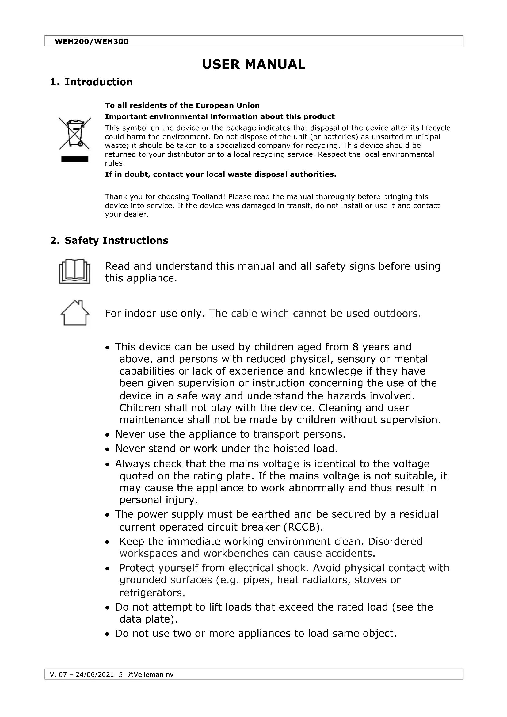 WEH200 - Electric winch Toolland - Free user manual and instructions