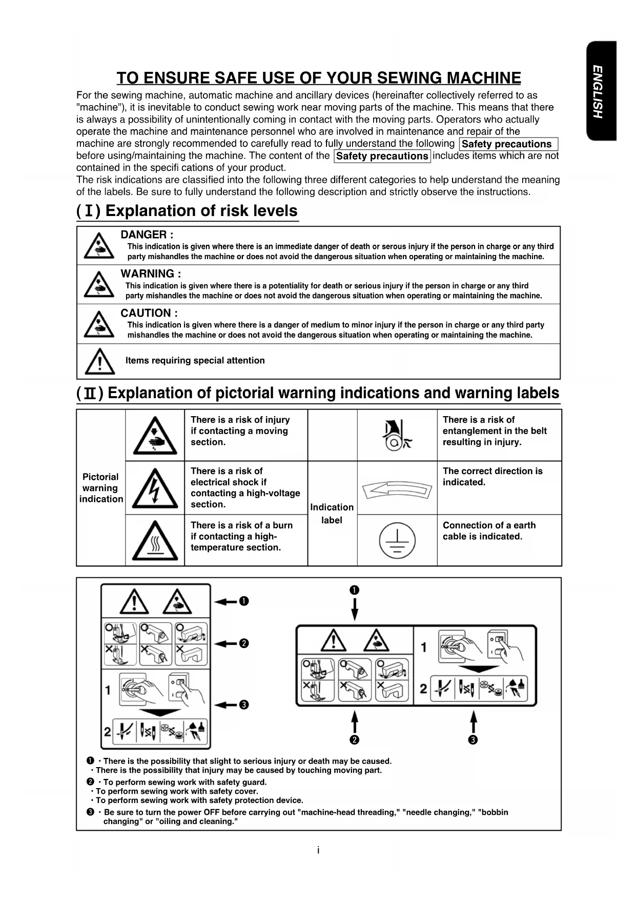 - Be sure to turn the power OFF before carrying out "machine-head threading," "needle changing," "bobbin changing" or "oiling and cleaning." For the sewing machine, automatic machine and ancillary devices (hereinafter collectively referred to as "machine"), it is inevitable to conduct sewing work near moving parts of the machine. This means that there is always a possibility of unintentionally coming in contact with the moving parts. Operators who actually operate the machine and maintenance personnel who are involved in maintenance and repair of the machine are strongly recommended to carefully read to fully understand the following Safety precautions before using/maintaining the machine. The content of the Safety precautions includes items which are not contained in the specifi cations of your product. The risk indications are classifi ed into the following three different categories to help understand the meaning of the labels. Be sure to fully understand the following description and strictly observe the instructions. TO ENSURE SAFE USE OF YOUR SEWING MACHINE