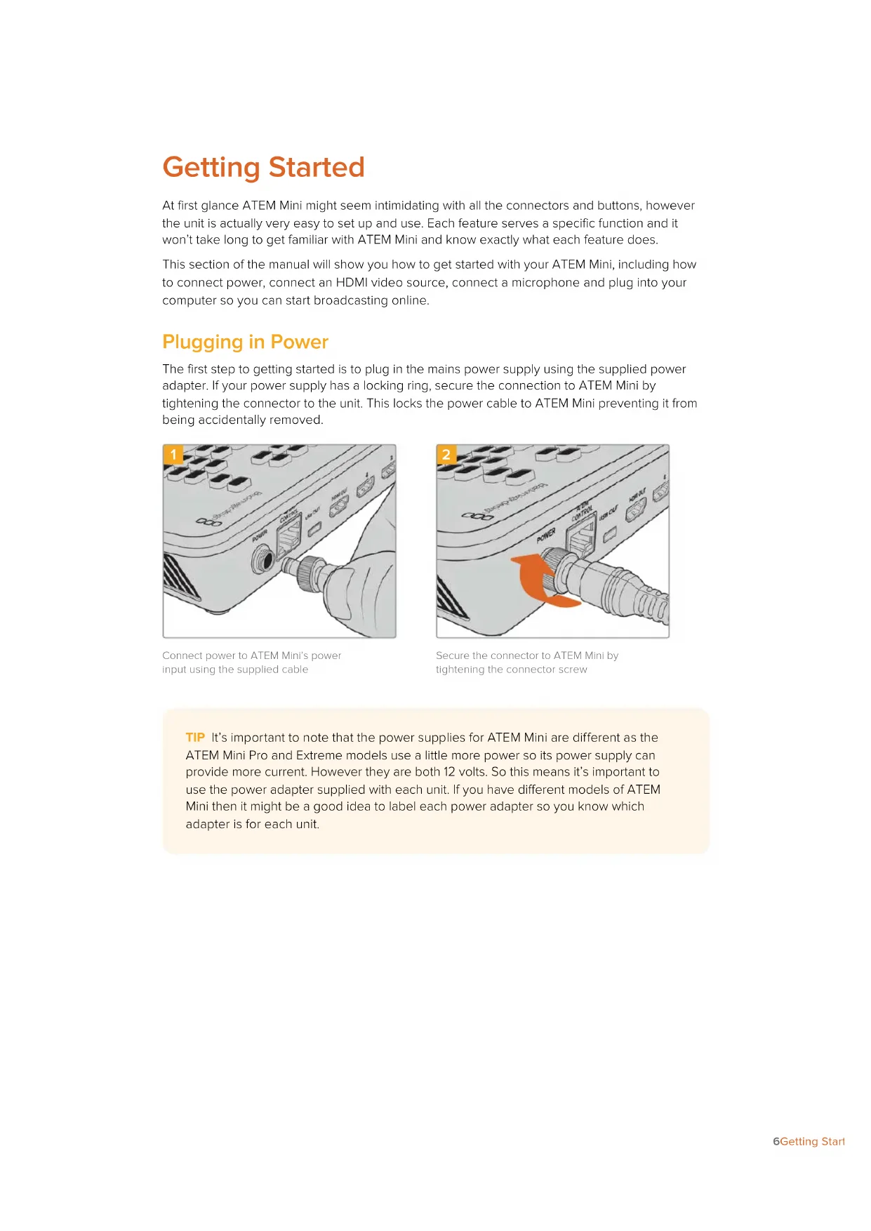 Connect power to ATEM Mini’s power input using the supplied cableSecure the connector to ATEM Mini by tightening the connector screw TIP It’s important to note that the power supplies for ATEM Mini are different as the ATEM Mini Pro and Extreme models use a little more power so its power supply can provide more current. However they are both 12 volts. So this means it’s important to use the power adapter supplied with each unit. If you have different models of ATEM Mini then it might be a good idea to label each power adapter so you know which adapter is for each unit. 6Getting StartedPlugging in Video Sources Plug your HDMI cameras and other HDMI sources into ATEM Mini’s HDMI inputs. The first input you plug in will set the video format, so if the first video source you plug in is 1080p50, all other inputs will automatically be converted to 1080p50. Plug HDMI sources into ATEM Mini’s four HDMI inputs Switch between your sources by selecting the large numbered buttons on the unit. Plugging in a Monitor and Testing Inputs With your video sources connected, you can now plug an HDMI television into ATEM Mini’s HDMI output and check all the inputs are working. This is also a good opportunity to check sources and see if your shots are smoothly switching between each other. Plug an HDMI television or monitor into ATEM Mini’s HDMI output so you can monitor your program output and check all your sources are working properly TIP ATEM Mini Pro and Extreme models have a powerful multiview feature that lets you see all your inputs, plus program and preview outputs simultaneously on one screen. For more information, refer to the ‘Using the Multiview’ section. 7Getting StartedTo check your sources, simply press the numbered video out buttons on ATEM Mini’s control panel and watch the HDMI television. If your sources are working correctly, you should see them switch between each other. On ATEM Mini Extreme models, the video out buttons select the source for the second HDMI output. Connect a Microphone When broadcasting a PowerPoint presentation or a Kickstarter video, you might want to use a microphone so your voice can be heard loud and clear. Plug a microphone, for example a small wireless collar microphone, into one of the 3.5mm audio inputs. If you are broadcasting an interview, plug the second microphone into the second 3.5mm audio input. You can even plug a music player into one of the audio inputs and mix it into your production. Connect microphones to ATEM Mini’s mic inputs To add the microphone to your audio mix, press the ‘on’ button. This switches the mic input on air until you press ‘off’. The button will illuminate red when on air. 8Getting StartedCut Transitions Now that you have your cameras and microphone connected, ATEM Mini is ready to start switching your production. This happens when you switch from one video source in your broadcast to another. A source can be any HDMI video signal connected to the HDMI inputs. It can also be a still graphic, a keyer, or any internal source like a color generator, color bars, or black. In the demonstration below ATEM Mini will cut from input 1 to input 2. To perform a cut: 1 Input 1 is illuminated red to indicate input 1 is currently live on air. 2 Select a ‘cut’ by pressing the ‘cut’ button. Pressing ‘cut’ tells ATEM Mini you want to use a straight cut instead of an auto transition. 3 Now press the input 2 button. Input 1 will now immediately switch to input 2 and you will see input 2 illuminated red, which means input 2 is now live on air. This is known as a cut as you are ‘cutting’ directly from one source to another. 9Getting StartedConnecting to Skype or Zoom Plug ATEM Mini’s webcam output into your computer’s USB input. Your computer will recognize ATEM Mini as a webcam and you can select it as the webcam source in your streaming program, such as Skype, Zoom or OBS Studio. Plug your computer into ATEM Mini’s webcam out USB-C connector Setting the Webcam Source In most cases, your streaming software will automatically set ATEM Mini as the webcam, so when you launch your streaming software you will see the picture from your ATEM Mini straight away. If your software doesn’t select ATEM Mini, simply set the software to use ATEM Mini as the webcam and microphone. Setting the Webcam on Skype