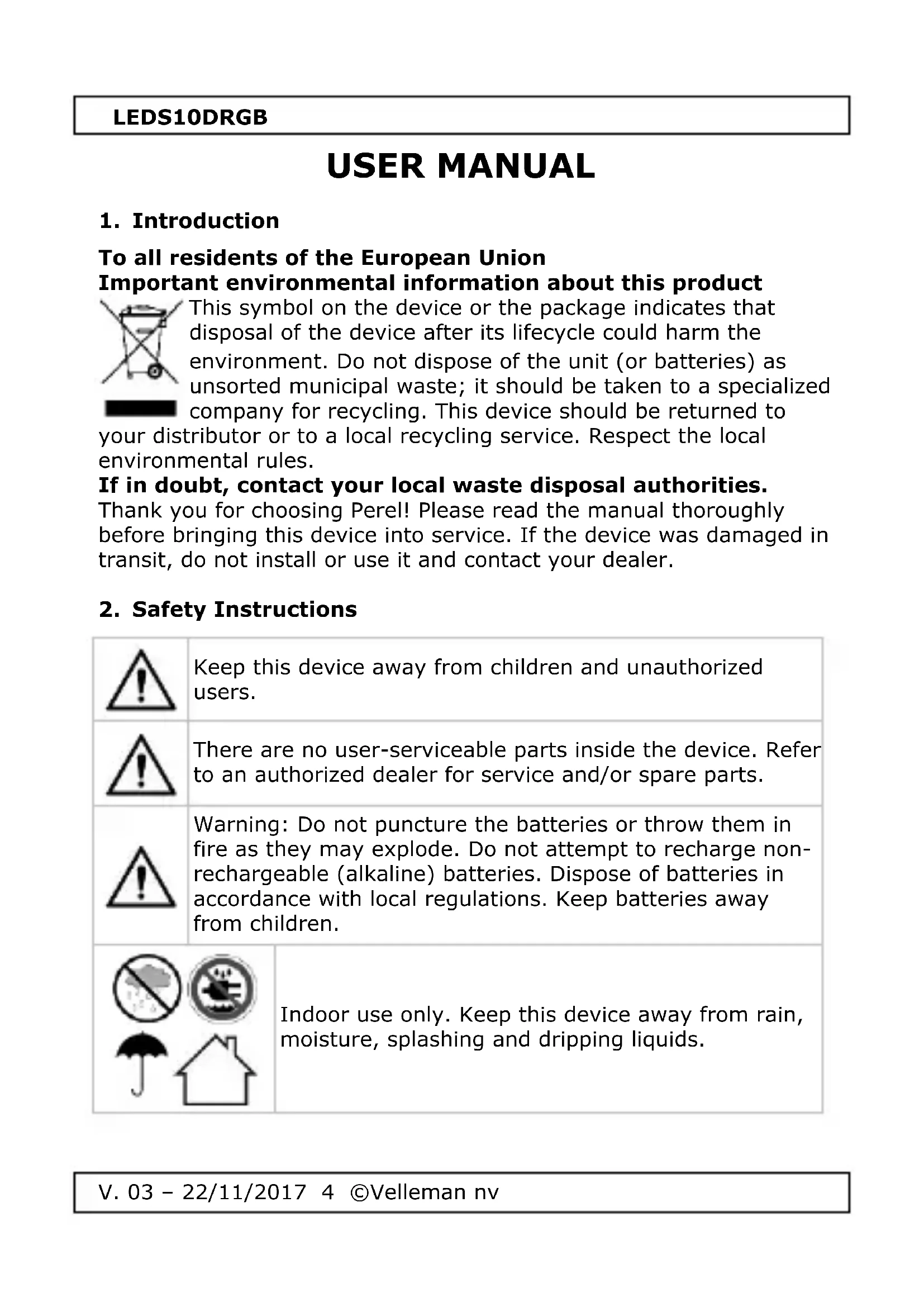 Use this device with original accessories only. Velleman nv cannot be held responsible in the event of damage or injury resulting from (incorrect) use of this device. For more info concerning this product and the latest version of this manual, please visit our website www.perel.eu. The information in this manual is subject to change without prior notice. © COPYRIGHT NOTICE The copyright to this manual is owned by Velleman nv. All worldwide rights reserved. No part of this manual may be copied, reproduced, translated or reduced to any electronic medium or otherwise without the prior written consent of the copyright holder.LEDS10DRGB
