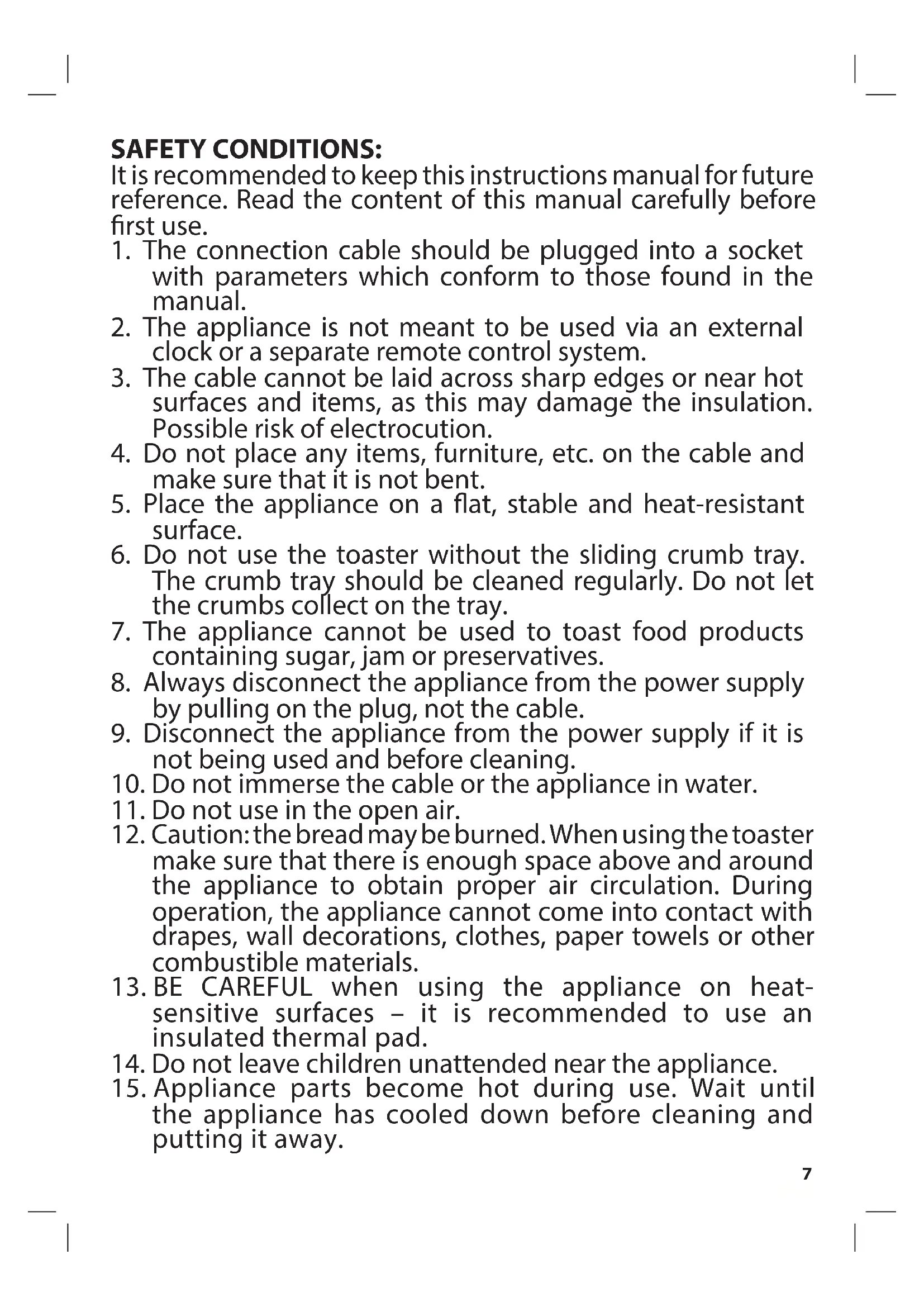 6. Do not use the toaster without the sliding crumb tray.