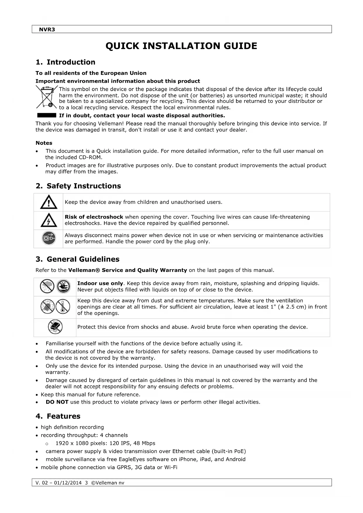 Use this device with original accessories only. Velleman nv cannot be held responsible in the event of damage or injury resulting from (incorrect) use of this device. For more info concerning this product and the latest version of this manual, please visit our website www.velleman.eu. The information in this manual is subject to change without prior notice. All registered trademarks and trade names are properties of their respective owners and are used only for the clarification of the compatibility of our products with the products of the different manufacturers. Windows, Windows Mobile are registered trademarks of Microsoft Corporation in the United States and other countries. iPad, iPod touch, iPhone, iOS are trademarks of Apple Inc., registered in the U.S. and other countries. Android is a trademark of Google Inc. The Trademark BlackBerry® is owned by Research In Motion Limited and is registered in the United States and may be pending or registered in other countries. Velleman NV is not endorsed, sponsored, affiliated with or otherwise authorized by Research In Motion Limited. Symbian is a registered trademark of Symbian Software Ltd, Symbian Ltd. Linux® is the registered trademark of Linus Torvalds in the U.S. and other countries. © COPYRIGHT NOTICE The copyright to this manual is owned by Velleman nv. All worldwide rights reserved. No part of this manual may be copied, reproduced, translated or reduced to any electronic medium or otherwise without the prior written consent of the copyright holder.NVR3