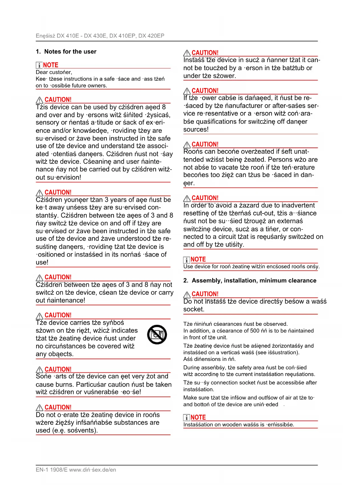 NOTE NOTE Dear customer, Keep these instructions in a safe place and pass them on to possible future owners. CAUTION! CAUTION! This device can be used by children aged 8 and over and by persons with limited physical, sensory or mental aptitude or lack of experi- ence and/or knowledge, providing they are supervised or have been instructed in the safe use of the device and understand the associ- ated potential dangers. Children must not play with the device. Cleaning and user mainte- nance may not be carried out by children with- out supervision! CAUTION! CAUTION! Children younger than 3 years of age must be kept away unless they are supervised con- stantly. Children between the ages of 3 and 8 may switch the device on and off if they are supervised or have been instructed in the safe use of the device and have understood the re- sulting dangers, providing that the device is positioned or installed in its normal place of use! CAUTION! CAUTION! Children between the ages of 3 and 8 may not switch on the device, clean the device or carry out maintenance! CAUTION! CAUTION! The device carries the symbol shown on the right, which indicates that the heating device must under no circumstances be covered with any objects. CAUTION! CAUTION! Some parts of the device can get very hot and cause burns. Particular caution must be taken with children or vulnerable people! CAUTION! CAUTION! Do not operate the heating device in rooms where highly inflammable substances are used (e.g. solvents). CAUTION! CAUTION! Install the device in such a manner that it can- not be touched by a person in the bathtub or under the shower. CAUTION! CAUTION! If the power cable is damaged, it must be re- placed by the manufacturer or after-sales ser- vice representative or a person with compara- ble qualifications for switching off danger sources! CAUTION! CAUTION! Rooms can become overheated if left unat- tended whilst being heated. Persons who are not able to vacate the room if the temperature becomes too high can thus be placed in dan- ger. CAUTION! CAUTION! In order to avoid a hazard due to inadvertent resetting of the thermal cut-out, this appliance must not be supplied through an external switching device, such as a timer, or con- nected to a circuit that is regularly switched on and off by the utility. NOTE NOTE Use device for room heating within enclosed rooms only.