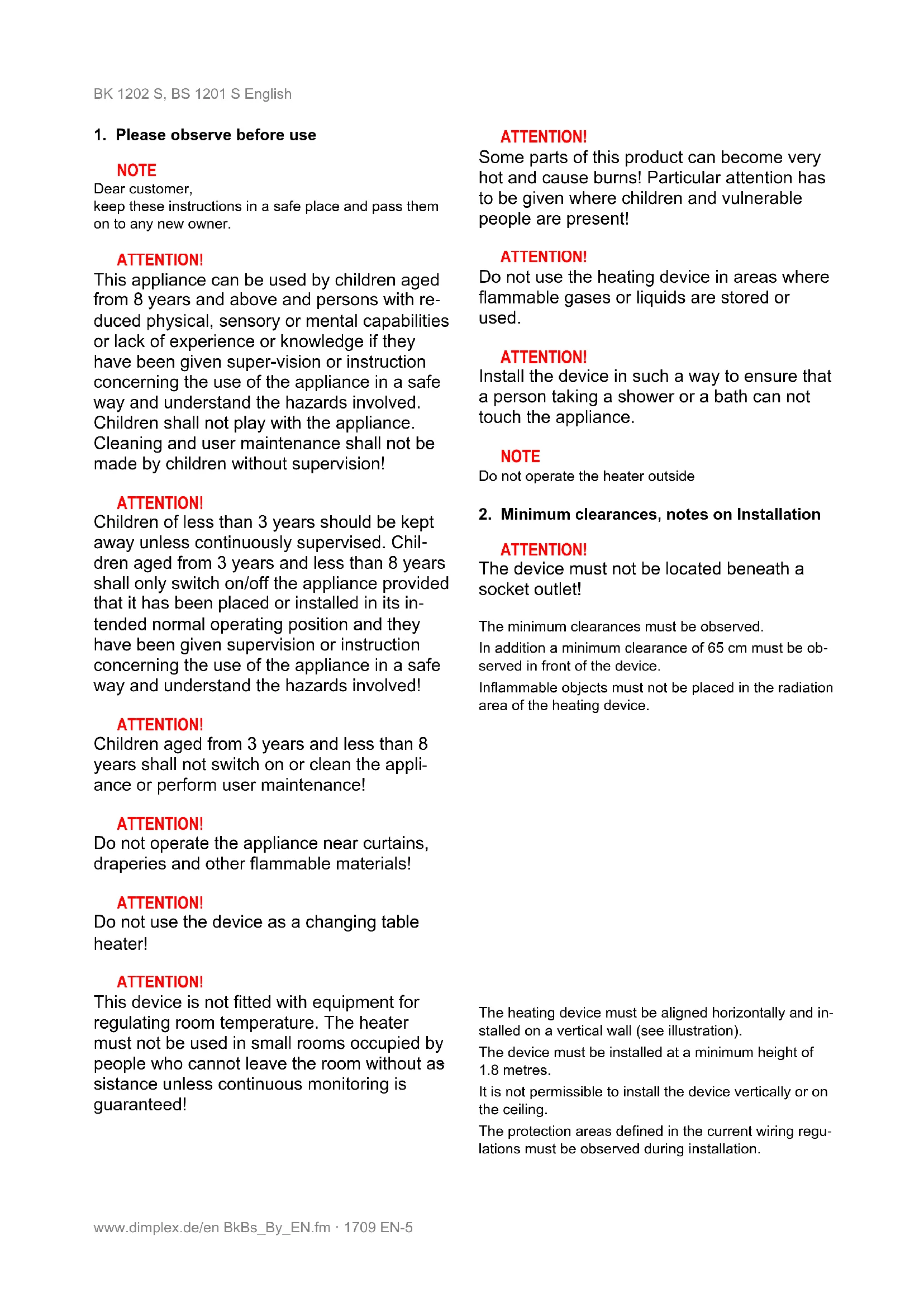 sistance unless continuous monitoring is guaranteed! ATTENTION! Some parts of this product can become very hot and cause burns! Particular attention has to be given where children and vulnerable people are present! ATTENTION! Do not use the heating device in areas where flammable gases or liquids are stored or used. ATTENTION! Install the device in such a way to ensure that a person taking a shower or a bath can not touch the appliance. NOTE Do not operate the heater outside