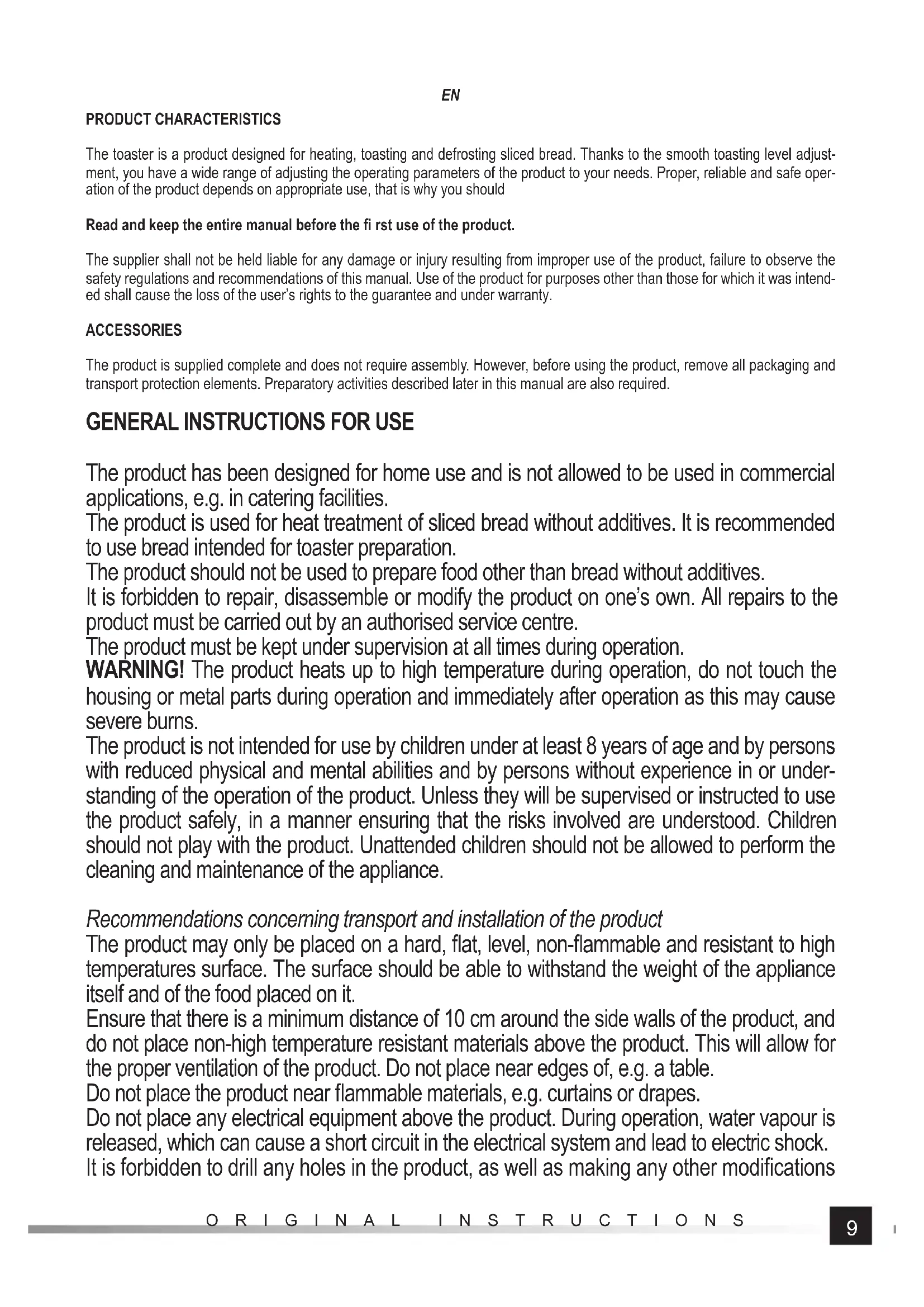 ORIGINAL INSTRUCTIONS PRODUCT CHARACTERISTICS The toaster is a product designed for heating, toasting and defrosting sliced bread. Thanks to the smooth toasting level adjust- ment, you have a wide range of adjusting the operating parameters of the product to your needs. Proper, reliable and safe oper- ation of the product depends on appropriate use, that is why you should Read and keep the entire manual before the fi rst use of the product. The supplier shall not be held liable for any damage or injury resulting from improper use of the product, failure to observe the safety regulations and recommendations of this manual. Use of the product for purposes other than those for which it was intend- ed shall cause the loss of the user’s rights to the guarantee and under warranty. ACCESSORIES The product is supplied complete and does not require assembly. However, before using the product, remove all packaging and transport protection elements. Preparatory activities described later in this manual are also required.