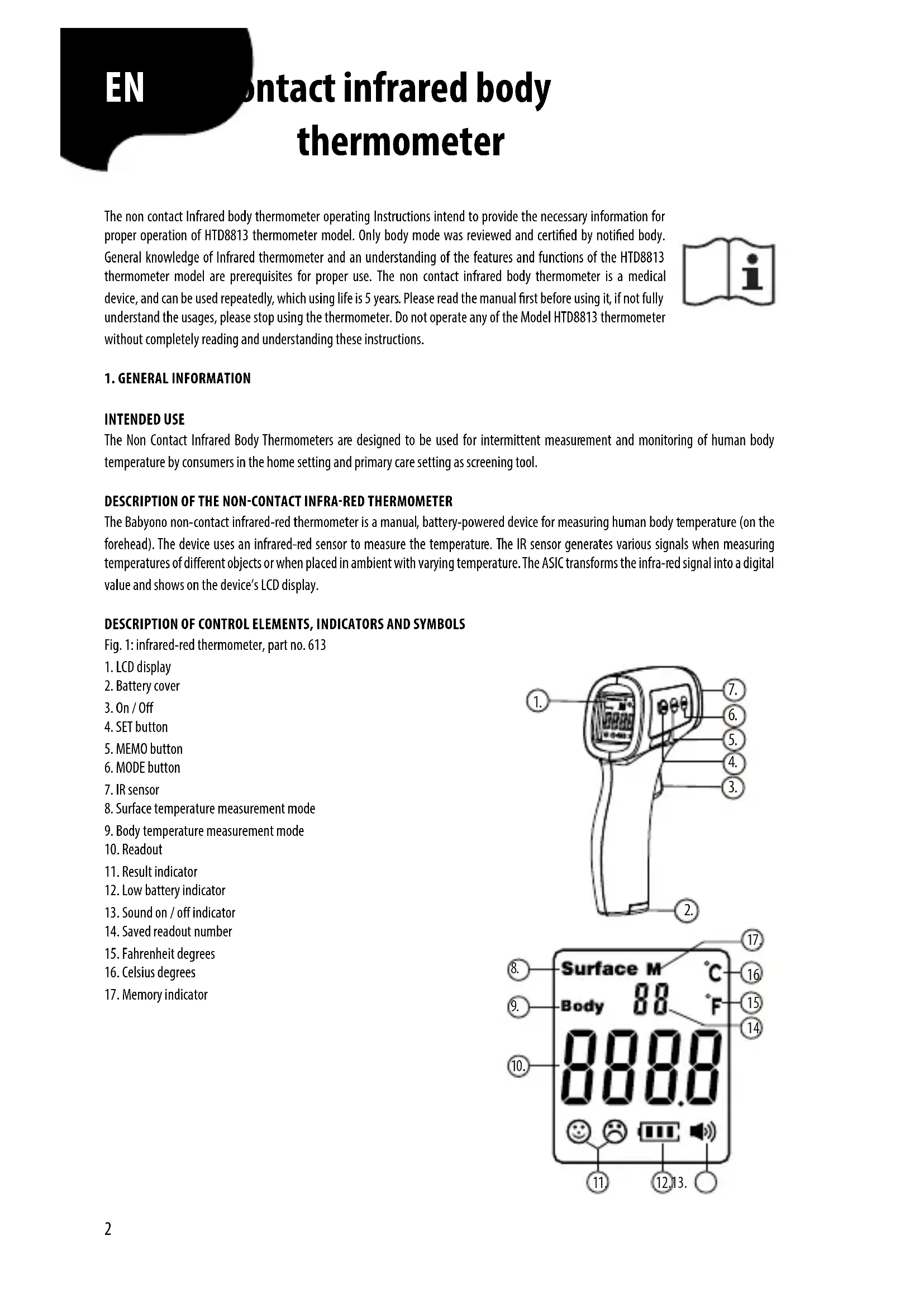 The Babyono non-contact infrared-red thermometer is a manual, battery-powered device for measuring human body temperature (on the forehead). The device uses an infrared-red sensor to measure the temperature. The IR sensor generates various signals when measuring temperatures of dierent objects or when placed in ambient with varying temperature. The ASIC transforms the infra-red signal into a digital value and shows on the device’s LCD display. DESCRIPTION OF CONTROL ELEMENTS, INDICATORS AND SYMBOLS Fig. 1: infrared-red thermometer, part no. 613