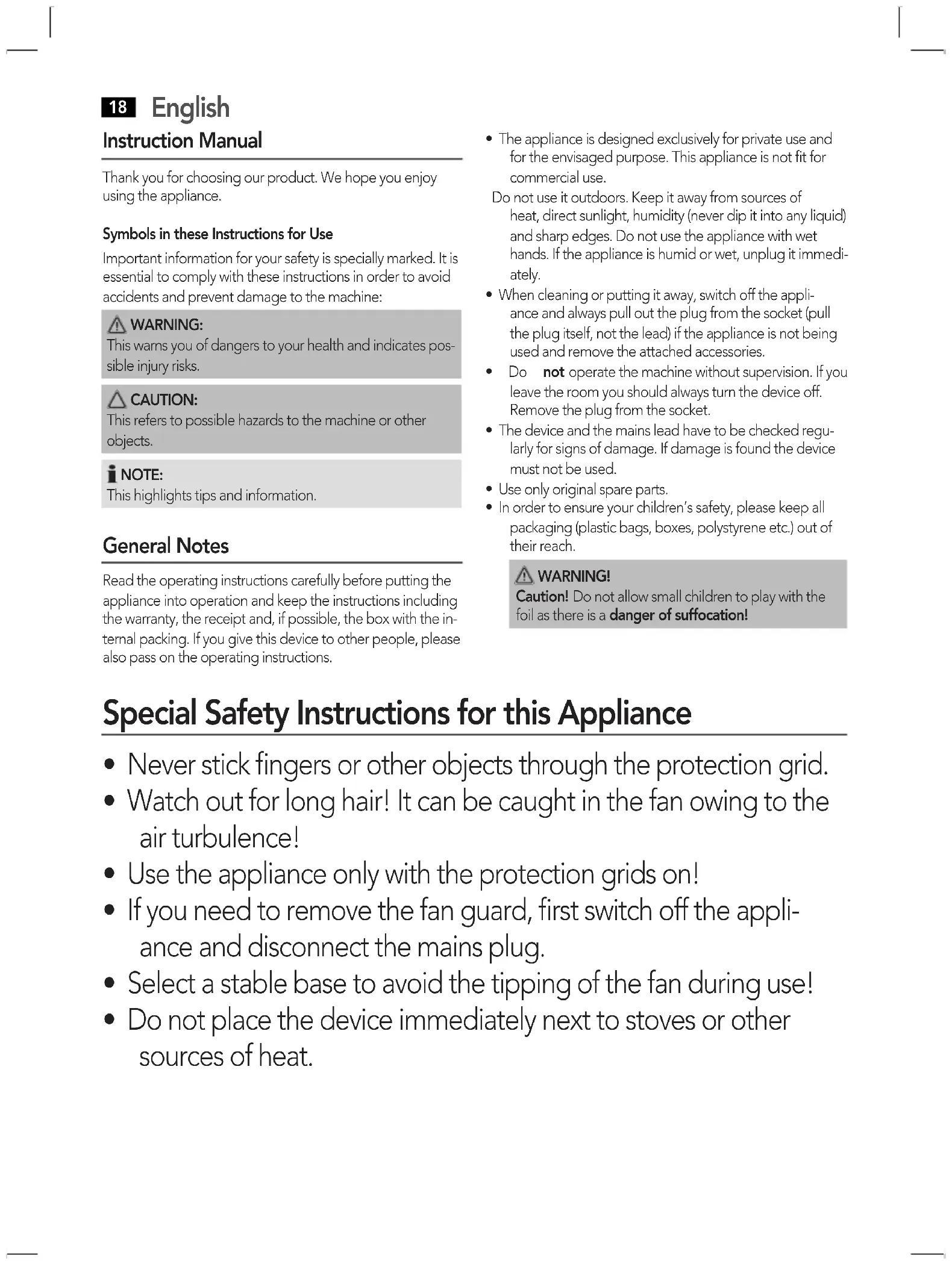 - Watch out for long hair! It can be caught in the fan owing to the air turbulence!