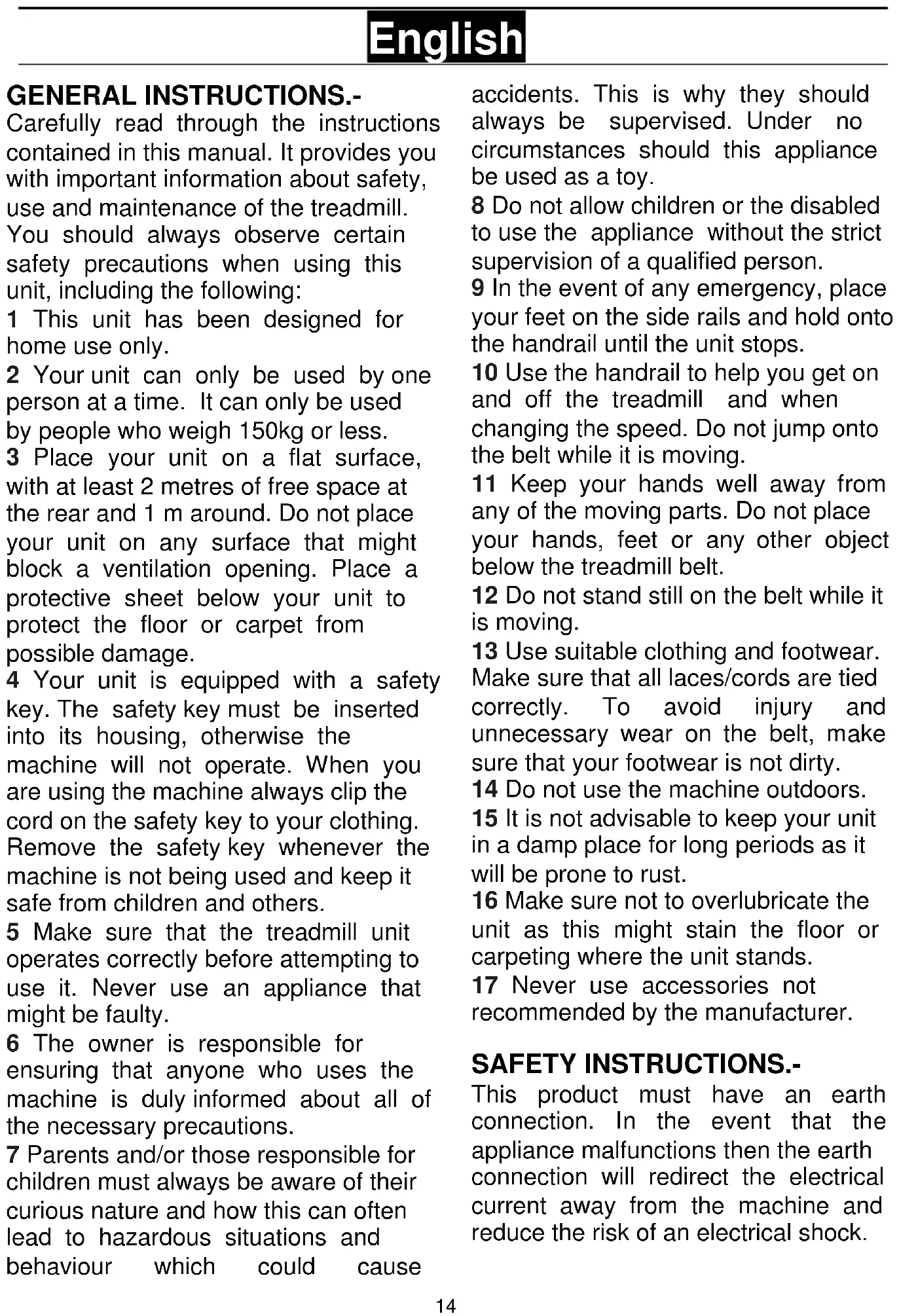 English GENERAL INSTRUCTIONS.- Carefully read through the instructions contained in this manual. It provides you with important information about safety, use and maintenance of the treadmill. You should always observe certain safety precautions when using this unit, including the following: 1 This unit has been designed for home use only. 2 Your unit can only be used by one person at a time. It can only be used by people who weigh 150kg or less. 3 Place your unit on a flat surface, with at least 2 metres of free space at the rear and 1 m around. Do not place your unit on any surface that might block a ventilation opening. Place a protective sheet below your unit to protect the floor or carpet from possible damage. 4 Your unit is equipped with a safety key. The safety key must be inserted into its housing, otherwise the machine will not operate. When you are using the machine always clip the cord on the safety key to your clothing. Remove the safety key whenever the machine is not being used and keep it safe from children and others. 5 Make sure that the treadmill unit operates correctly before attempting to use it. Never use an appliance that might be faulty. 6 The owner is responsible for ensuring that anyone who uses the machine is duly informed about all of the necessary precautions. 7 Parents and/or those responsible for children must always be aware of their curious nature and how this can often lead to hazardous situations and behaviour which could cause accidents. This is why they should always be supervised. Under no circumstances should this appliance be used as a toy. 8 Do not allow children or the disabled to use the appliance without the strict supervision of a qualified person. 9 In the event of any emergency, place your feet on the side rails and hold onto the handrail until the unit stops. 10 Use the handrail to help you get on and off the treadmill and when changing the speed. Do not jump onto the belt while it is moving. 11 Keep your hands well away from any of the moving parts. Do not place your hands, feet or any other object below the treadmill belt. 12 Do not stand still on the belt while it is moving. 13 Use suitable clothing and footwear. Make sure that all laces/cords are tied correctly. To avoid injury and unnecessary wear on the belt, make sure that your footwear is not dirty. 14 Do not use the machine outdoors. 15 It is not advisable to keep your unit in a damp place for long periods as it will be prone to rust. 16 Make sure not to overlubricate the unit as this might stain the floor or carpeting where the unit stands. 17 Never use accessories not recommended by the manufacturer. SAFETY INSTRUCTIONS.- This product must have an earth connection. In the event that the appliance malfunctions then the earth connection will redirect the electrical current away from the machine and reduce the risk of an electrical shock.15