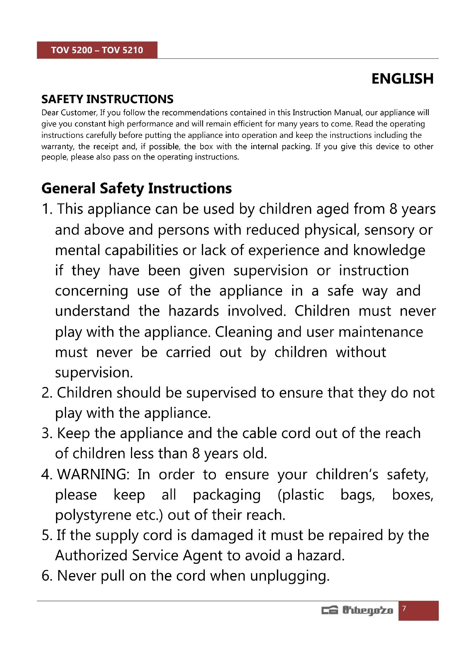 USER MANUAL TOV 5210 Orbegozo