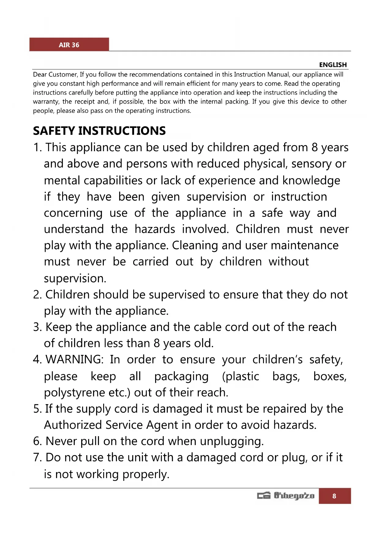 USER MANUAL AIR 36 Orbegozo