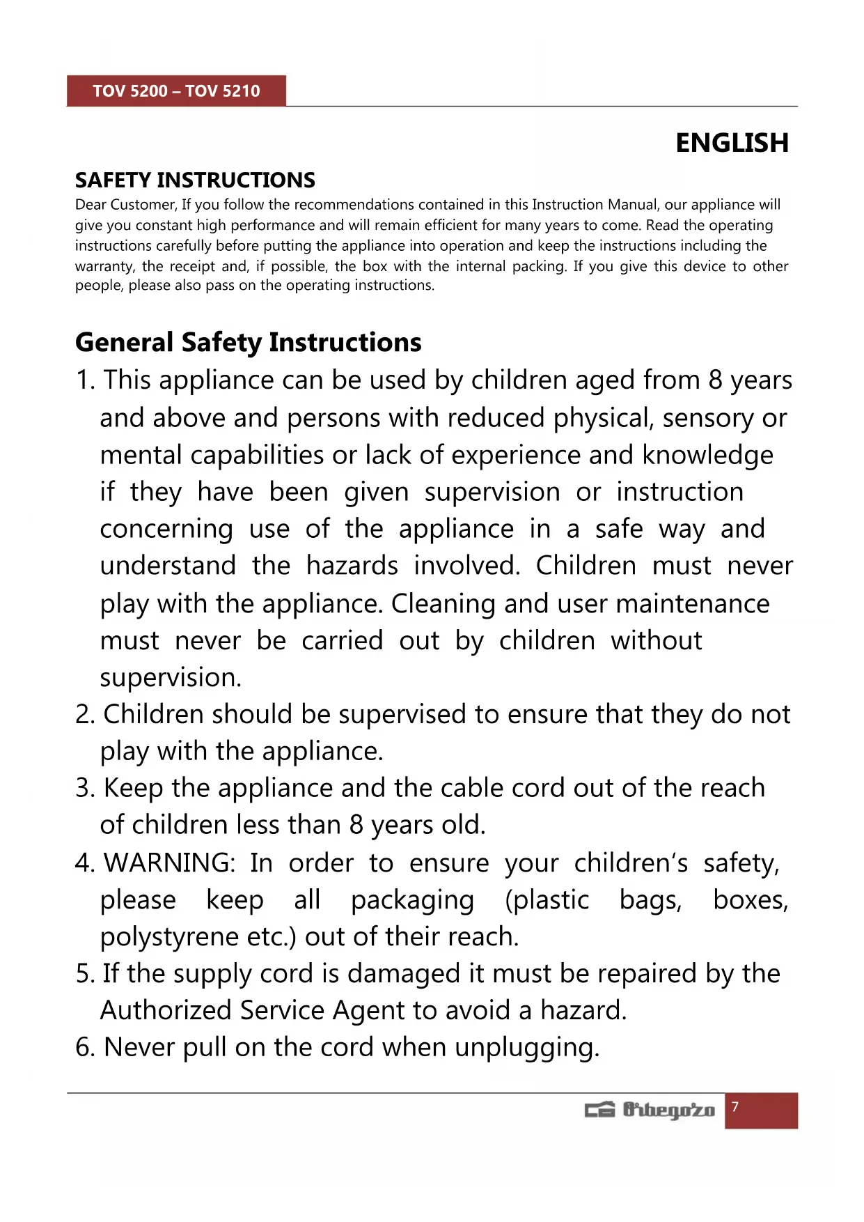 The European directive 2012/19/EU on Waste Electrical and Electronic Equipment (WEEE), requires that old household electrical appliances must not be disposed of in the normal unsorted municipal waste stream. Old appliances must be collected separately in order to optimize the recovery and recycling of the materials they contain, and reduce the impact on human health and the environment. The crossed out “wheeled bin” symbol on the product reminds you of your obligation, that when you dispose of the appliance, it must be separately collected. Consumers should contact their local authority or retailer for information concerning the correct disposal of their old appliance. DECLARATION OF CONFORMITY: This device complies with the requirements of the Low Voltage Directive 2014/35/EU and the requirements of the EMC directive 2014/30/EU. GUARANTEE This appliance is covered and is entitled to the legal guarantee in accordance with the legislation in force from the date of purchase. Keep the purchase receipt to be able to claim your right to the guarantee. To find the closest service to your location, contact through the following web link: https://orbegozo.com/asistencia-tecnica/ For any type of query, doubt or incident, you can contact us through our email shown on the main page of this manual or through our technical assistance service at https://orbegozo.com/contacto/ Orbegozo is not responsible for components and accessories that are subject to wear and tear due to use, as well as perishable compounds or those that have deteriorated due to improper use. Nor will it be held responsible if the owner has technically modified the device. Check the legal conditions on our website.TOV 5200 – TOV 5210