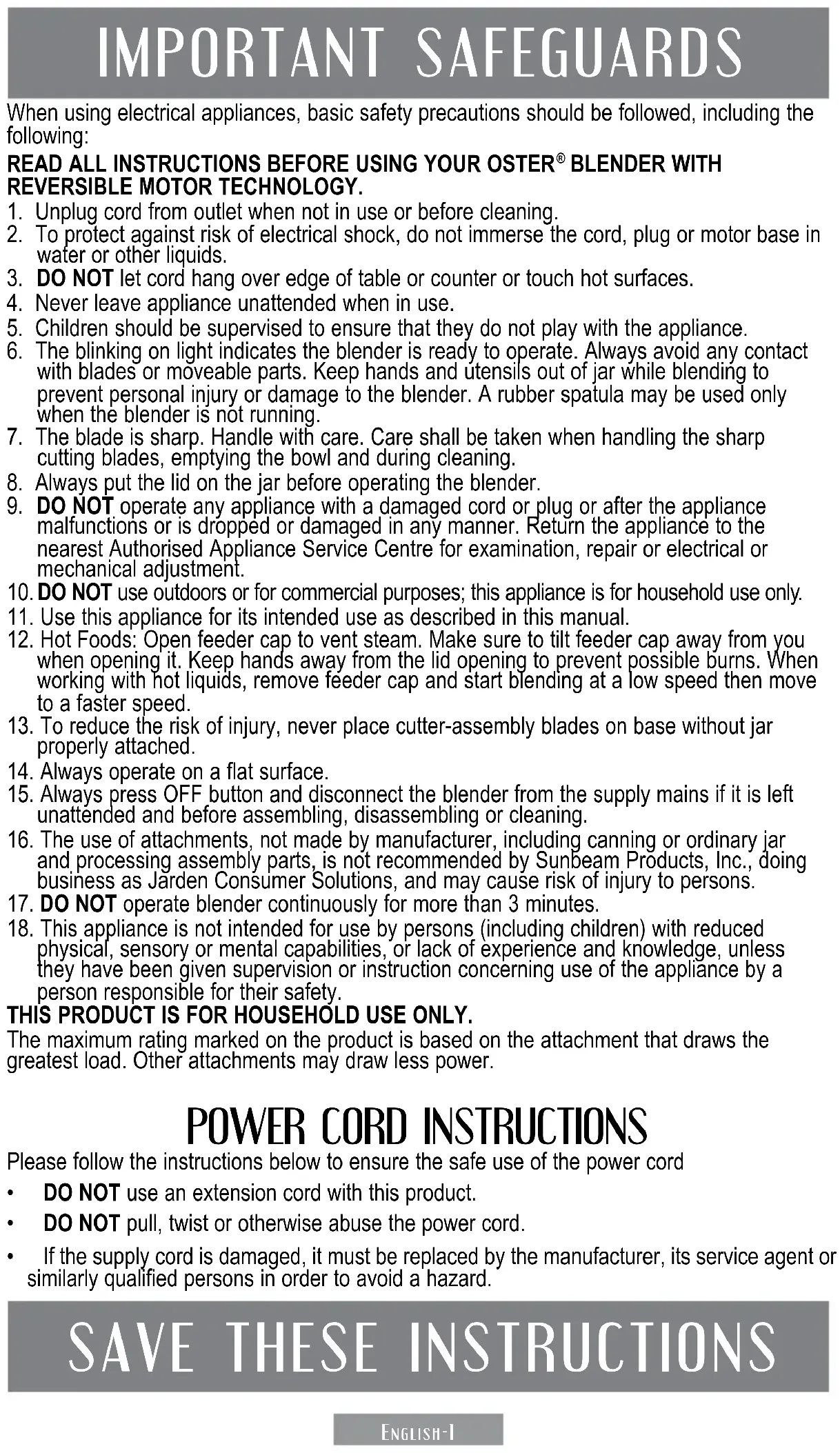 BRLY07-Z00 & BRLY07-R00English-1 When using electrical appliances, basic safety precautions should be followed, including the following: READ ALL INSTRUCTIONS BEFORE USING YOUR OSTER