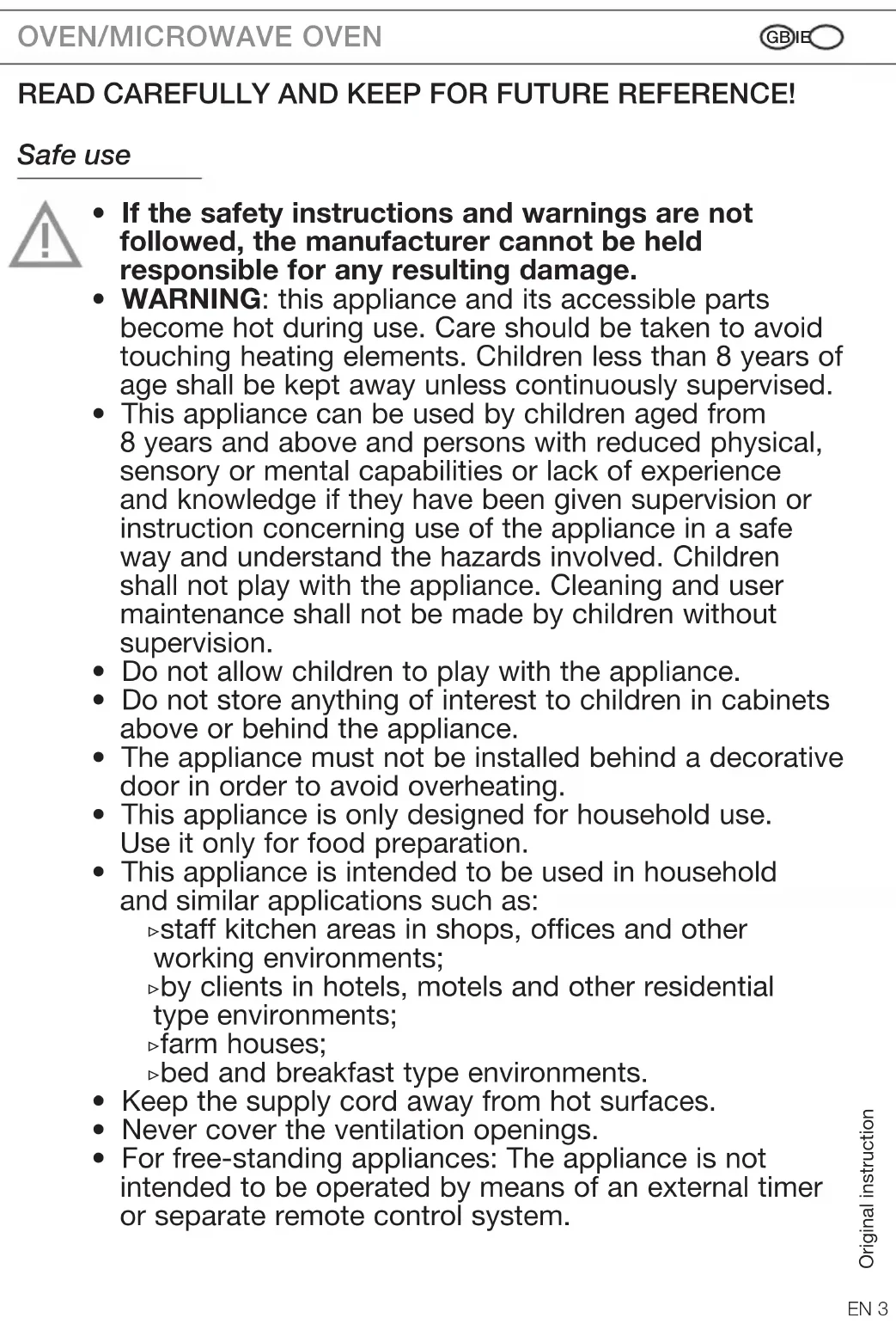 - For free-standing appliances: The appliance is not intended to be operated by means of an external timer or separate remote control system. Original instruction GB IEEN 4