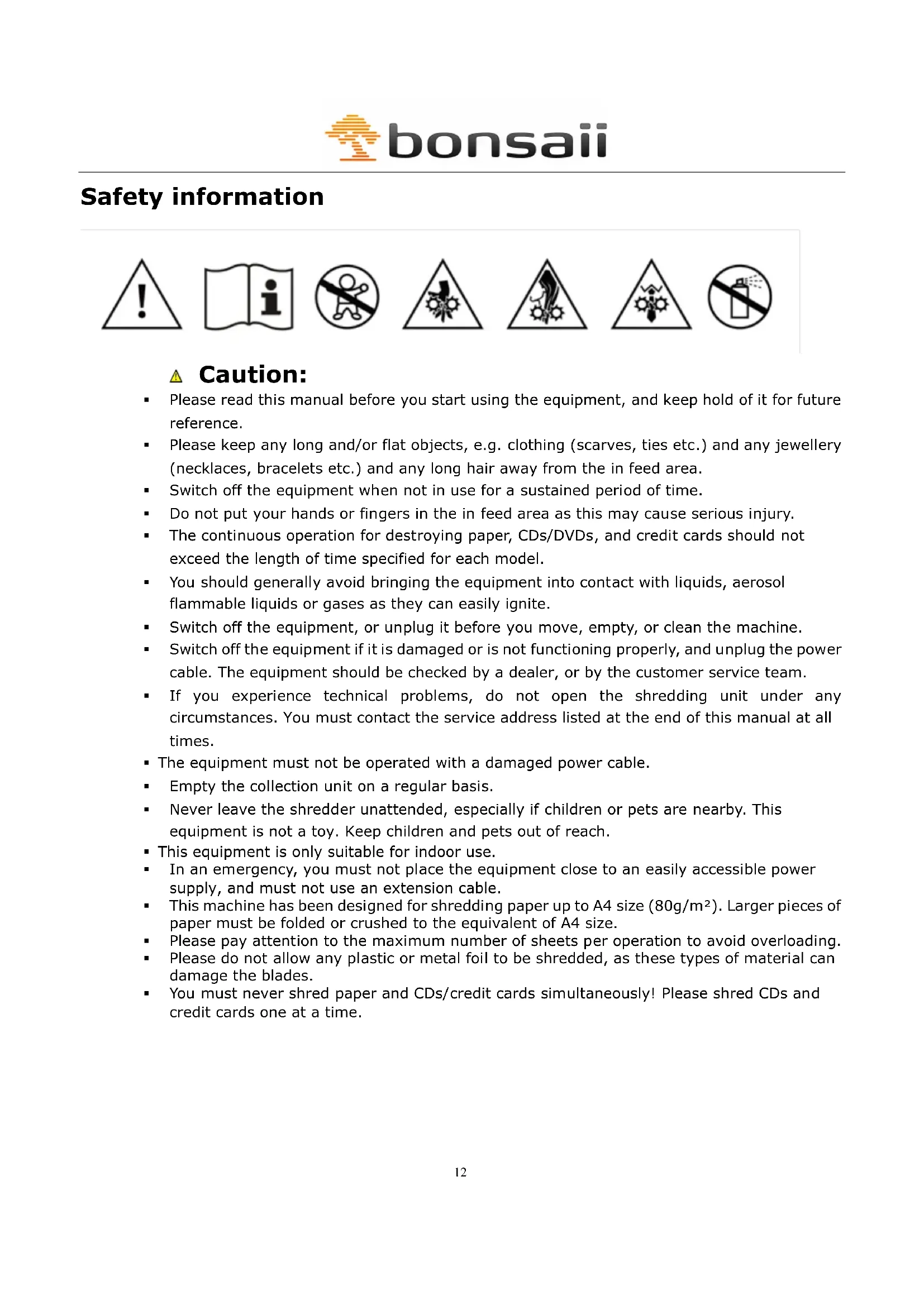 Our service hotline: Tel. +49 (0) 61 22-72 79 89 1 ● Fax +49 (0) 61 22-70 59 52 Email: bonsaii@gerth-gmbh.de All returned items must be sent to the following address by registered post: GENIE GmbH & Co KG│Bonsai-Service-│Berta-Cramer-Ring 22│D-65205 Wiesbaden17 General troubleshooting Error Troubleshooting Resolution Equipment is not functioning Is the power supply and socket connected to the wall correctly? Adjust the connections. Is the collection unit positioned correctly? Adjust the position of the collection unit. Is the power cable damaged? Replace the power cable or contact your Bonsaii dealer. Is the engine possibly overheating? Is the light flashing? Wait until the machine has cooled down. Is the sheet of paper to thin for it to be detected by the sensors? Fold the sheets of paper or use the manual in feed tray . Do you want to shred many pieces of paper in one go? Reduce the amount of paper and try again. Cutter is blocked Is the paper jammed? Press the back button and remove any excess paper. Cutter will not stop Excess paper or unusual objects are blocking the sensors? Remove any excess paper and try again. Machine sounds too loud Is the surface uneven? Is the equipment in a straight position? Place the equipment on a flat surface. Should the instructions above not help to resolve the issue, then please contact your Bonsaii dealer. Equipment maintenance and cleaning As the cutter blades are very sharp and the engine is particularly powerful, you should take the appropriate precautions when using the equipment on a daily basis to ensure that any items of clothing, ties, scarves and hair do not fall into the equipment!18 The collection unit must be regularly checked and emptied if possible to ensure it is able to operate smoothly. Do not allow any items of clothing, plastic, or metal fragments to fall into the cutter. It is advised to use a number of sheets of paper below the technical capacity in order to achieve a long life expectancy. Please regularly check the collection container and empty it if necessary to ensure smooth operation. Wear or damage to the shredder can decrease the reliability of the data destruction, so please check from time to time, the size of the material particles. For a permanently quiet and smooth operation, we recommend the use of a Bonsaii care kit approximately after every 500 sheets. Run the (Cleaning Kit) through the shredder. The shredder will as such be uniformly cleaned and oiled. The care kit is available from specialist retailers or by contacting the Bonsaii service hotline. You must disconnect the plug first when cleaning the equipment. It must then be cleaned on the outside by using a cloth and mild soap solution. The cloth should only be damp and not wet. Avoid any liquids from penetrating into the cutter. Do not use bleach, alcohol, paint stripper, or any other flammable liquids under any circumstances. Packaging contents Item Paper shredder Power cable User manual Quantity 1 1 1