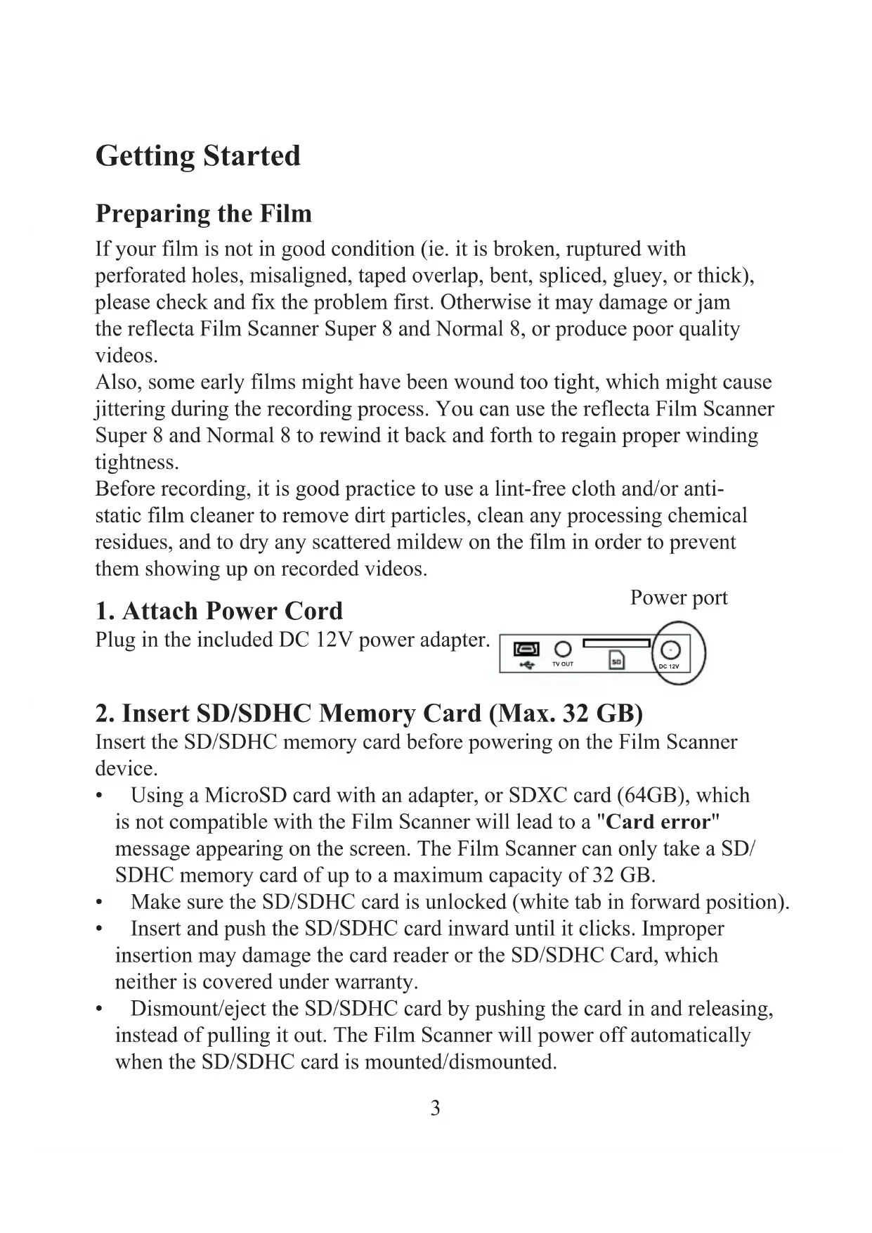 - Dismount/eject the SD/SDHC card by pushing the card in and releasing, instead of pulling it out. The Film Scanner will power off automatically when the SD/SDHC card is mounted/dismounted. DC 12V TV OUT Power portEN