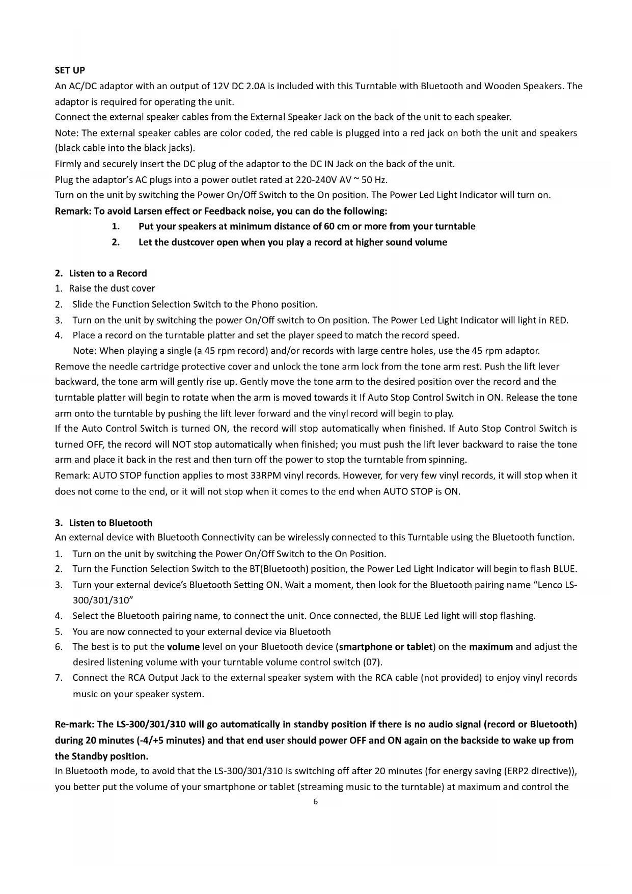 music on your speaker system. Re-mark: The LS-300/301/310 will go automatically in standby position if there is no audio signal (record or Bluetooth) during 20 minutes (-4/+5 minutes) and that end user should power OFF and ON again on the backside to wake up from the Standby position. In Bluetooth mode, to avoid that the LS-300/301/310 is switching off after 20 minutes (for energy saving (ERP2 directive)), you better put the volume of your smartphone or tablet (streaming music to the turntable) at maximum and control the7 volume with the rotating button of the turntable. “This product has a bluetooth reception function, you can not transmit any bluetooth sound with it: this means that you can receive wirelessly a bluetooth sound signal from an external source like a smartphone.” Lenco