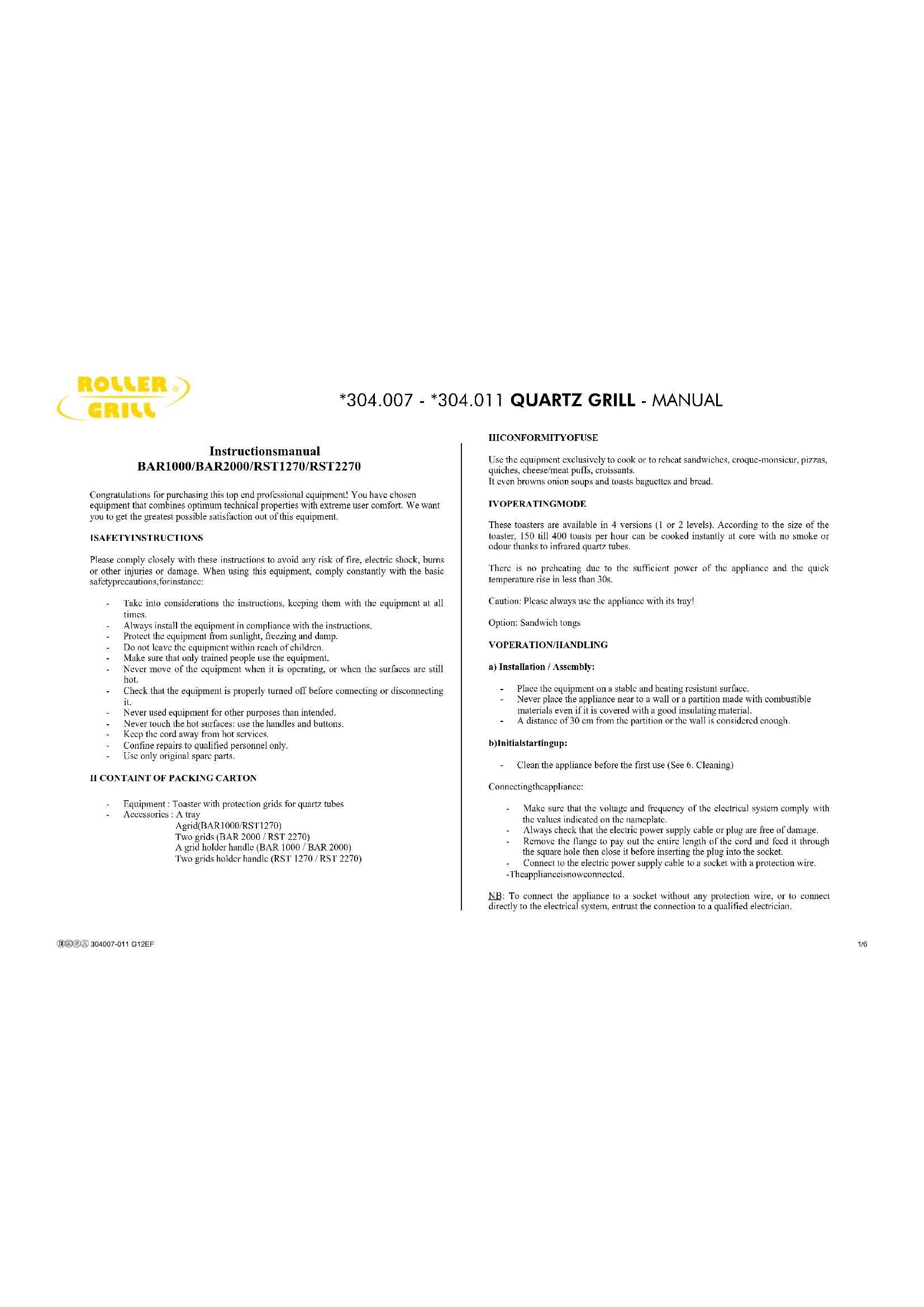 Download the instructions for your Grill plate in PDF format for free! Find your manual 304007 - ROLLER GRILL and take your electronic device back in hand. On this page are published all the documents necessary for the use of your device. 304007 by ROLLER GRILL.