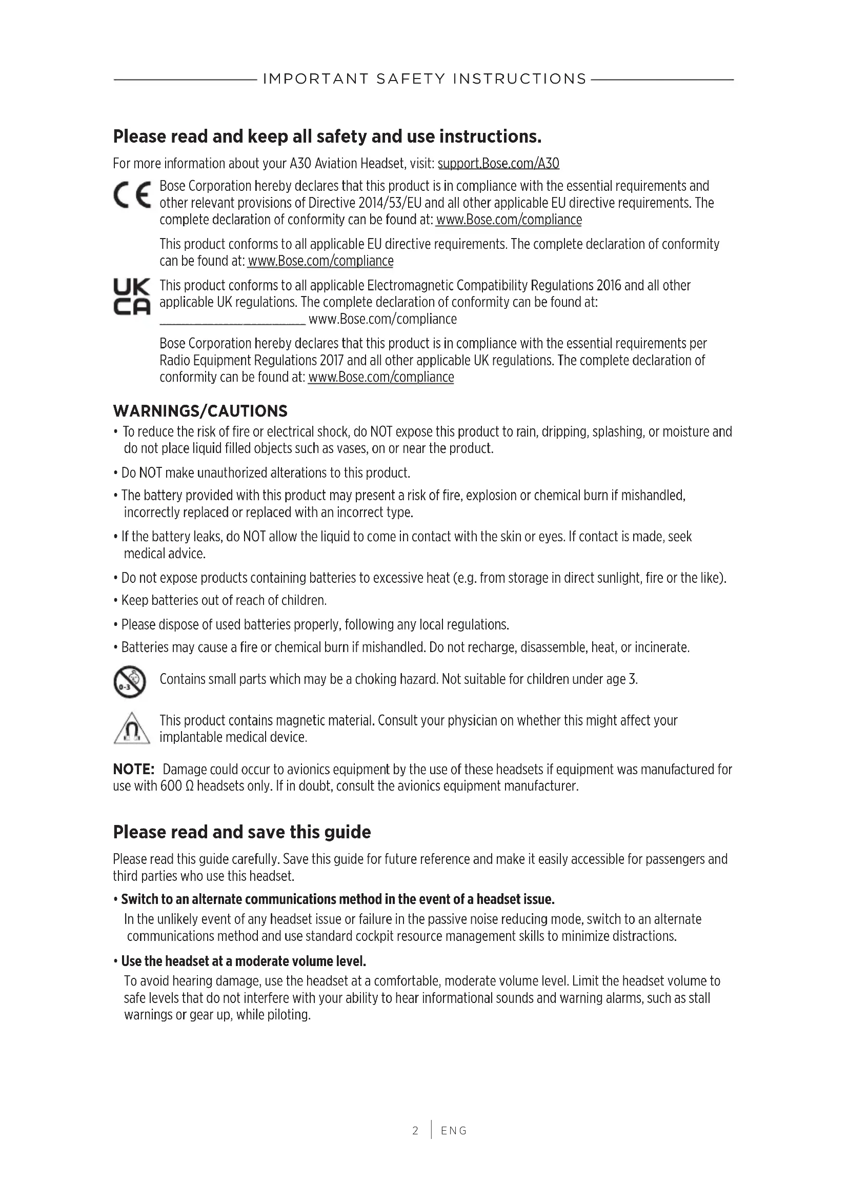 Please read and keep all safety and use instructions. For more information about your A30 Aviation Headset, visit: support.Bose.com/A30support.Bose.com/A30 Bose Corporation hereby declares that this product is in compliance with the essential requirements and other relevant provisions of Directive 2014/53/EU and all other applicable EU directive requirements. The complete declaration of conformity can be found at: www.Bose.com/compliancewww.Bose.com/compliance This product conforms to all applicable EU directive requirements. The complete declaration of conformity can be found at: www.Bose.com/compliancewww.Bose.com/compliance This product conforms to all applicable Electromagnetic Compatibility Regulations 2016 and all other applicable UK regulations. The complete declaration of conformity can be found at: www.Bose.com/compliancewww.Bose.com/compliance Bose Corporation hereby declares that this product is in compliance with the essential requirements per Radio Equipment Regulations 2017 and all other applicable UK regulations. The complete declaration of conformity can be found at: www.Bose.com/compliancewww.Bose.com/compliance WARNINGS/CAUTIONS