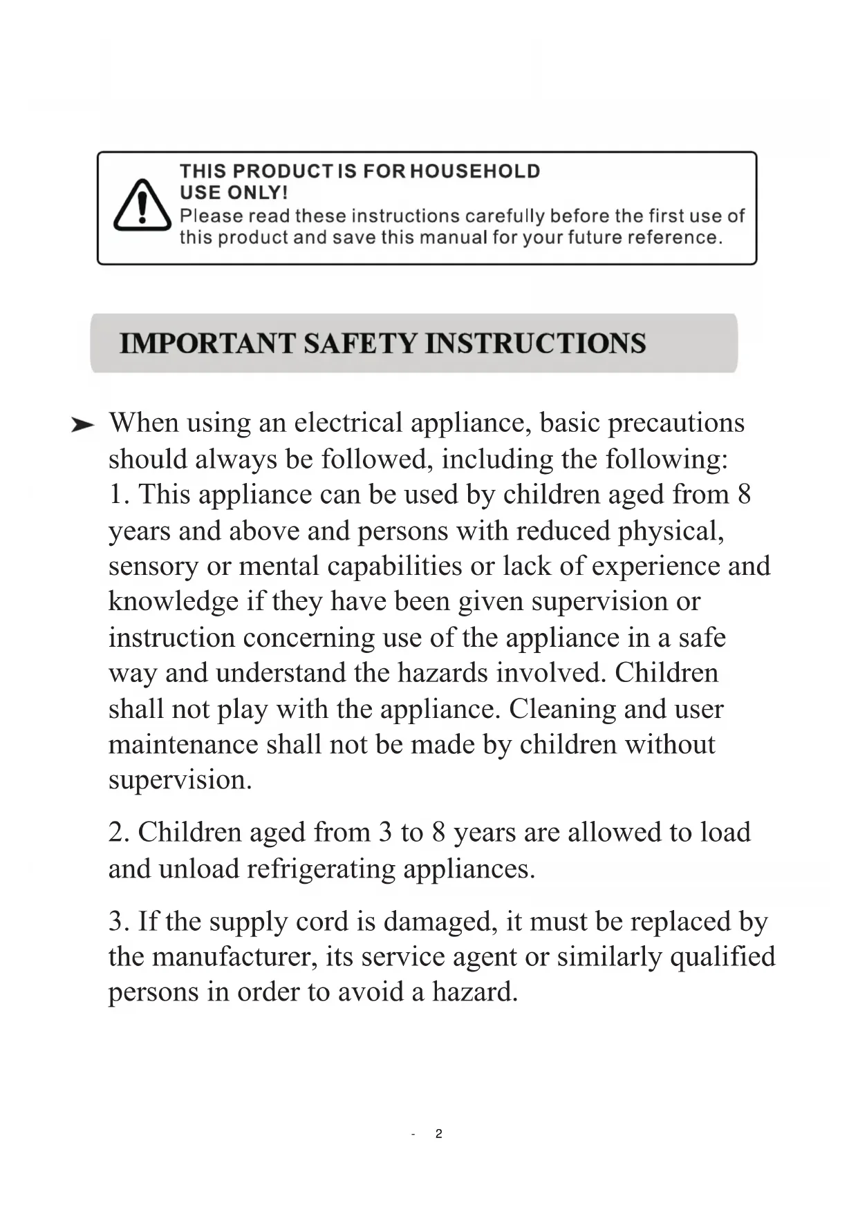 years and above and persons with reduced physical, sensory or mental capabilities or lack of experience and knowledge if they have been given supervision or instruction concerning use of the appliance in a safe way and understand the hazards involved. Children shall not play with the appliance. Cleaning and user maintenance shall not be made by children without supervision.