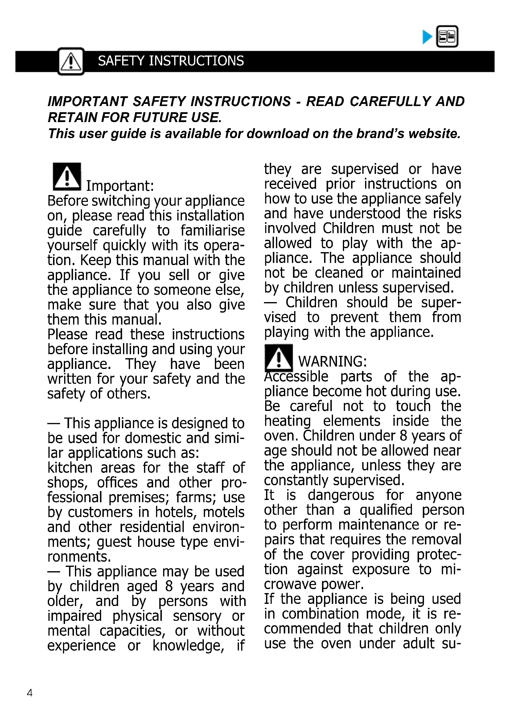 Accessible parts of the ap- pliance become hot during use. Be careful not to touch the heating elements inside the oven. Children under 8 years of age should not be allowed near the appliance, unless they are constantly supervised. It is dangerous for anyone other than a qualied person to perform maintenance or re- pairs that requires the removal of the cover providing protec- tion against exposure to mi- crowave power. If the appliance is being used in combination mode, it is re- commended that children only use the oven under adult su- IMPORTANT SAFETY INSTRUCTIONS - READ CAREFULLY AND RETAIN FOR FUTURE USE. This user guide is available for download on the brand’s website.5