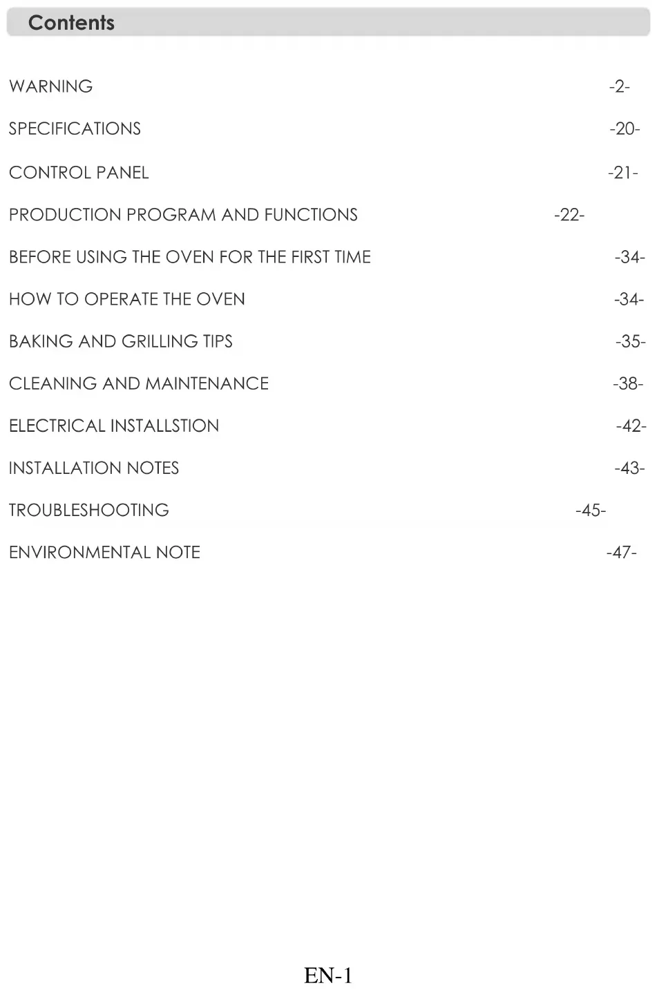 Lamp have defectiveness Change for a new lamp No electrical current Check if the oven have electrical current Oven stop working in a sudden during working Power interrupt Check your kitchen light or other appliance whether still working on Normal close thermostat protective Check if the cool fan are working, if yes, need change for a new normal close thermostat Oven not heating when operation Not adjust the temperature controller Set up the temperature If this model have timer, you may not set up the time Set up the timer No power Check the power box Heating element was damaged Change for a new heating element Water come out from the glass door when working Door seal is blow-by Change for a new door seal Hinge is not strong enough Change for a new hingeEN-46 IMPORTANT: If your appliance appears not to be operating correctly, Please contact with dealer. DO NOT ATTEMPT TO REPAIR THE APPLIANCE YOURSELF.