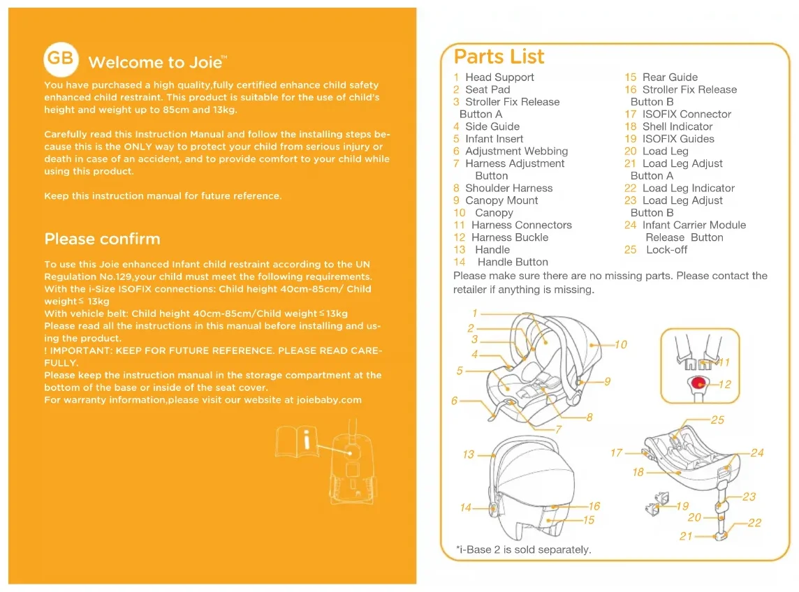 You have purchased a high quality﹐fully certified enhance child safety enhanced child restraint. This product is suitable for the use of child’s height and weight up to 85cm and 13kg.Carefully read this Instruction Manual and follow the installing steps be-cause this is the ONLY way to protect your child from serious injury or death in case of an accident﹐ and to provide comfort to your child while using this product.Keep this instruction manual for future reference. Please confirm To use this Joie enhanced Infant child restraint according to the UN Regulation No.129﹐your child must meet the following requirements.With the i-Size ISOFIX connections: Child height 40cm-85cm/ Child weight