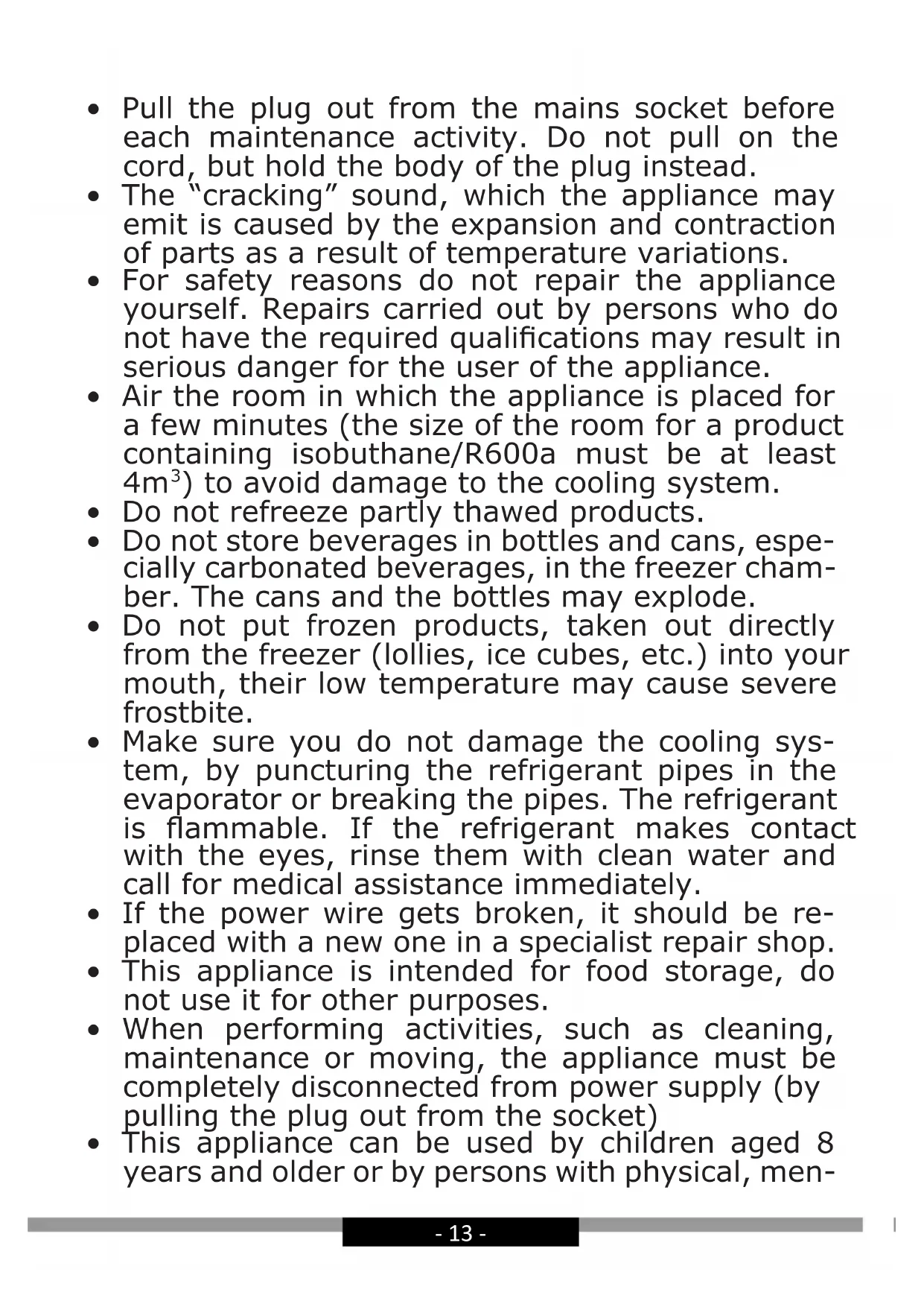 - Do not put frozen products, taken out directly from the freezer (lollies, ice cubes, etc.) into your mouth, their low temperature may cause severe frostbite.