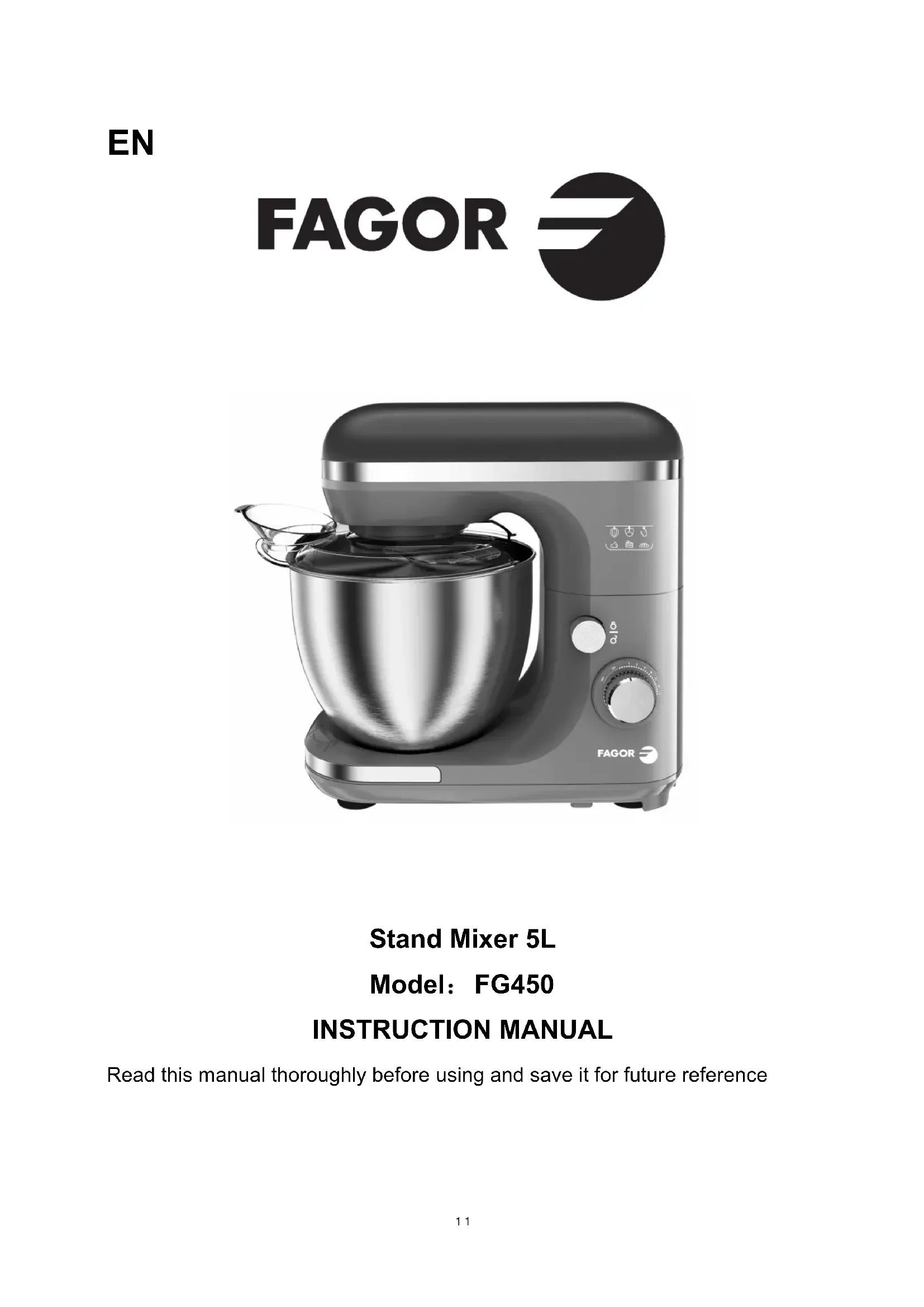 Stand Mixer 5L Model FG450 INSTRUCTION MANUAL Read this manual thoroughly before using and save it for future reference 11IMPORTANT SAFEGUARDS Before using the electrical appliance, the following basic precautions should always be followed including the following: