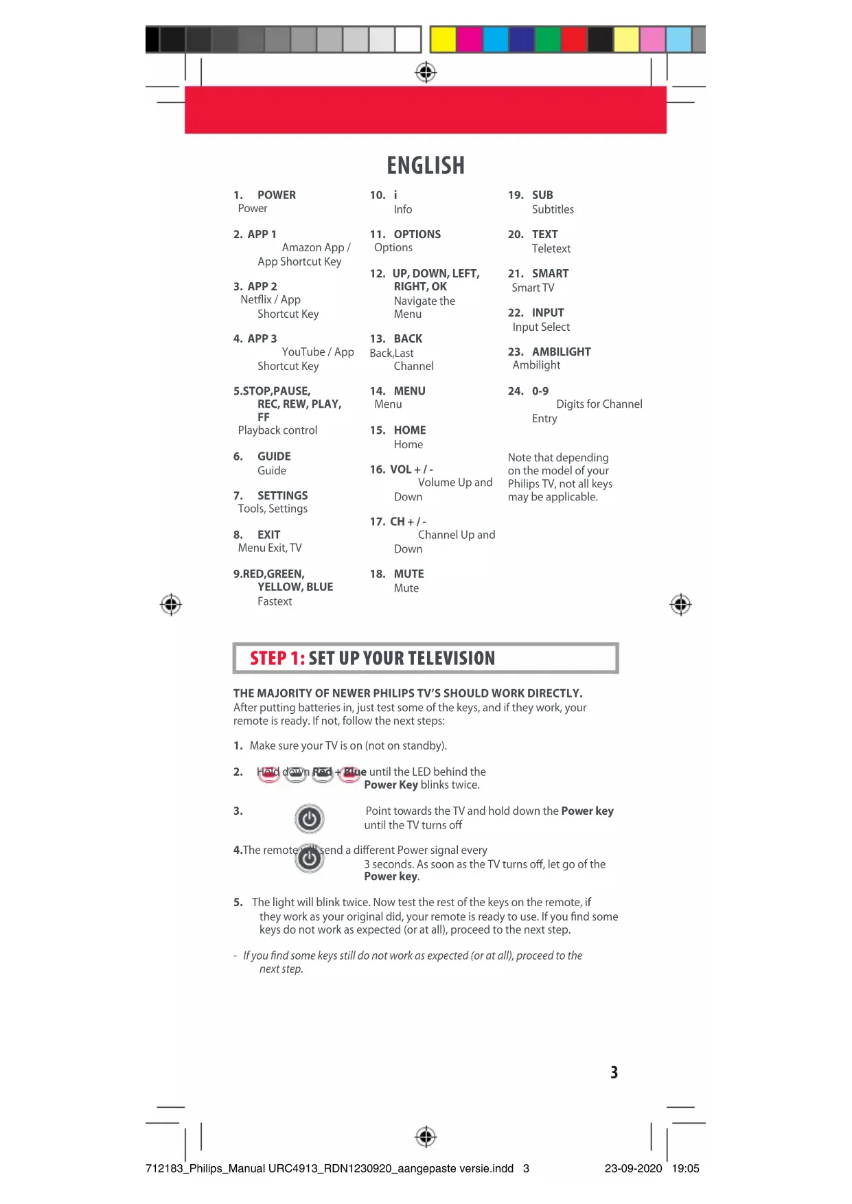 STEP 2: IF STEP 1 DOES NOT WORK AS EXPECTED 712183_Philips_Manual URC4913_RDN1230920_aangepaste versie.indd 4712183_Philips_Manual URC4913_RDN1230920_aangepaste versie.indd 4 23-09-2020 19:0523-09-2020 19:055 ENGLISH SOUND BAR / AUDIO RECEIVER VOLUME CONTROL If you have your TV connected to a Sound Bar or Audio Receiver, it’s possible to set up your One For All remote to control the Volume and Mute of this device. There are two ways to do this:AUDIO SIMPLESETIf you have a Sound Bar or Audio Device from one of the brands listed in the table below, you can use the SimpleSet method to program your remote to control it. If you do not have one of the below brands, please proceed to the next section.Note that each of the brands has a digit associated with it, for example 4 for LG (and JVC).To set up your remote to control your Sound Bar / Audio Device, rst make sure your TV and Sound Bar / Audio Device are both powered on, and that there is something playing that you can hear (this procedure will test the Mute function). Next: