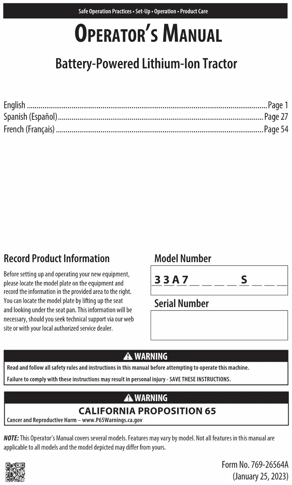 Safe Operation Practices • Set-Up • Operation • Product Care OperatOr’s Manual Battery-Powered Lithium-Ion Tractor NOTE: This Operator’s Manual covers several models. Features may vary by model. Not all features in this manual are applicable to all models and the model depicted may differ from yours. Record Product Information Before setting up and operating your new equipment, please locate the model plate on the equipment and record the information in the provided area to the right. You can locate the model plate by lifting up the seat and looking under the seat pan. This information will be necessary, should you seek technical support via our web site or with your local authorized service dealer. Model Number 3 3 A 7