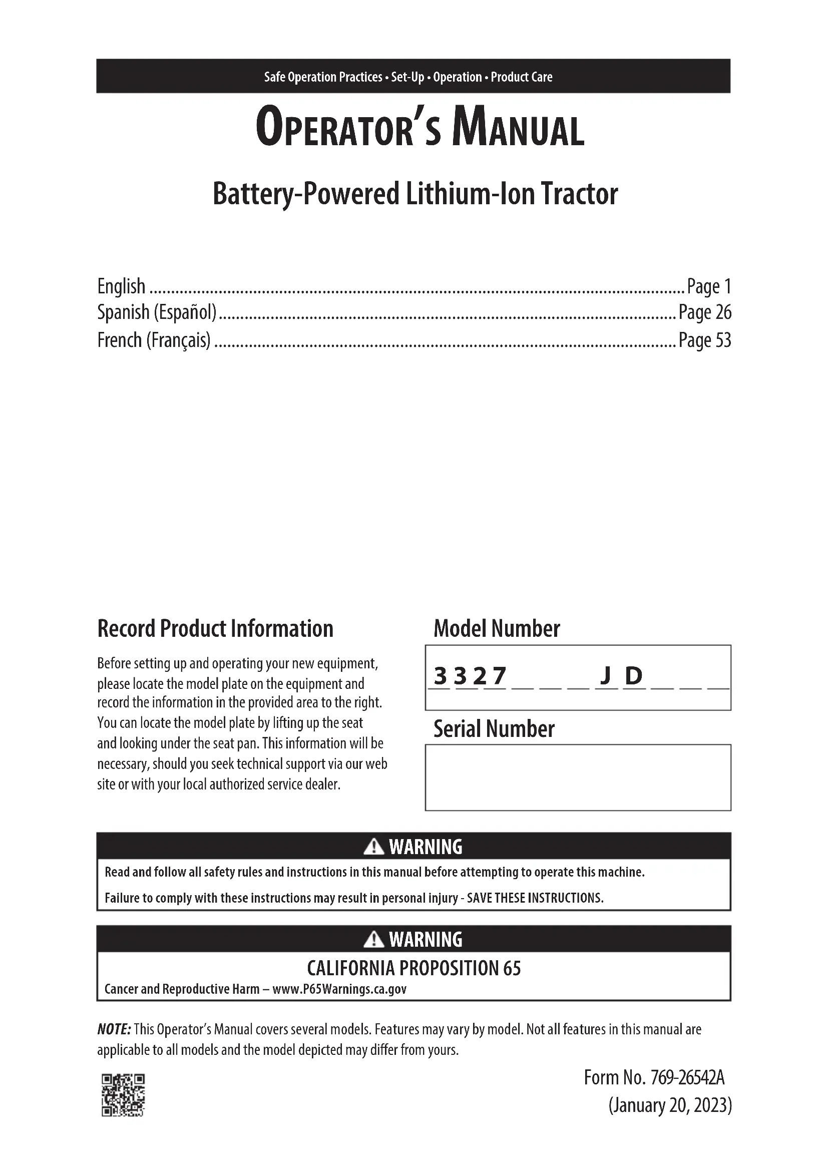 J D Serial Number English ............................................................................................................................Page 1 Spanish (Español) ..........................................................................................................Page 26 French (Français) ...........................................................................................................Page 53 Form No. 769-26542A (January 20, 2023) NOTE: This Operator’s Manual covers several models. Features may vary by model. Not all features in this manual are applicable to all models and the model depicted may differ from yours. WARNING Read and follow all safety rules and instructions in this manual before attempting to operate this machine. Failure to comply with these instructions may result in personal injury - SAVE THESE INSTRUCTIONS. WARNING CALIFORNIA PROPOSITION 65 Cancer and Reproductive Harm – www.P65Warnings.ca.gov2